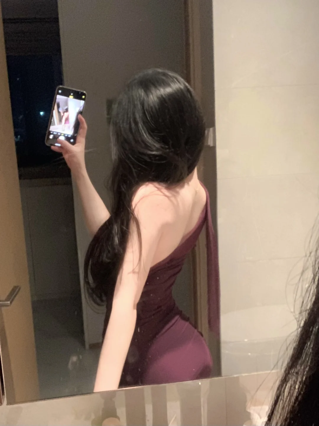 优雅红衣配紫色裙,闪耀高跟鞋,夜晚酒店里的时尚女王。