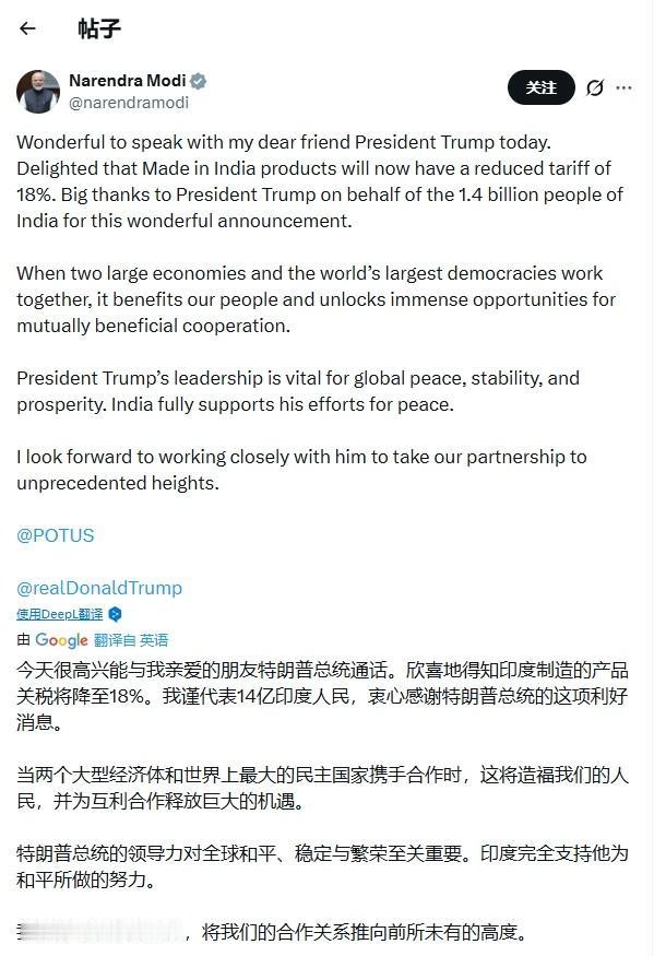 特朗普降低对印度关税,一场文字游戏? 美国与印度的关税谈判谈妥了? 2日,特朗普在社交媒体上宣布,他与印度总理莫迪通了电话,莫迪向他承诺印度将停止购买俄罗斯石油,改买美国或委内瑞拉石油,以及购买5000亿美元的美国商品,因此美国对印度的关税将从25%降低到18%。 莫迪随即也证实他和特朗普通了电话,但有两点非常耐人寻味: 其一,莫迪仅表示“他很高兴得知美国对印度的关税降低到18%”,只字未提特朗普所说的“印度将购买5000亿美元的美国商品”; 其二,特朗普对印度征收的关税税率应该是50%。25%是所谓的“对等关税”,另外25%则是因印度购买俄罗斯石油而征收的“惩罚关税”。 问题也就出在这里。特朗普虽然表示莫迪承诺放弃购买俄罗斯石油,他也相应把其中25%的关税降低到18%,但没有明确另外25%的关税是否取消。 因此,由于美印双方披露的细节实在不多,现在还不能认为特朗普和莫迪已经就关税问题达成了协议,毕竟这两位可都是赢学领域的宗师,说不定他们当天的表态只是另一场宣传噱头。