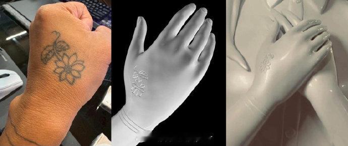 大S雕像上有纹身大S雕像细节 为大S定制的雕像,将爱与思念刻入每个细节。手背小花
