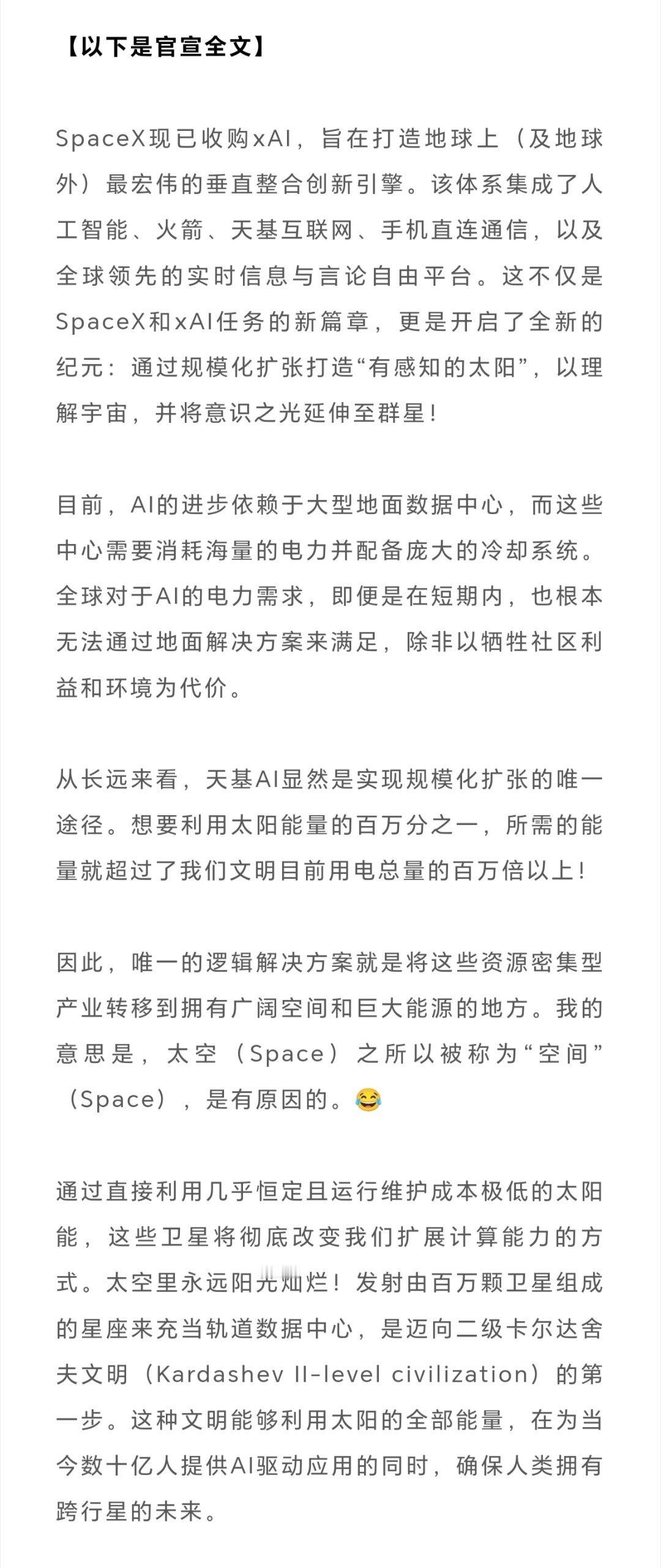 今天被SpaceX官宣收购xAI的新闻刷屏了,其实这背后的驱动还是马斯克整个研制+运营+应用大系统垂直整合自闭环的核心逻辑