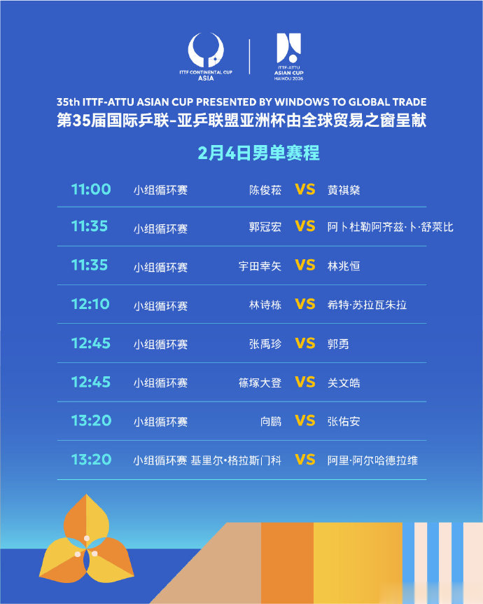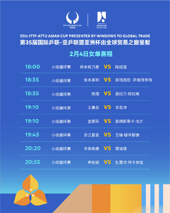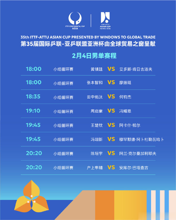 虎扑02月03日讯2026年乒乓球亚洲杯在海口举办,2月4日赛程公布。