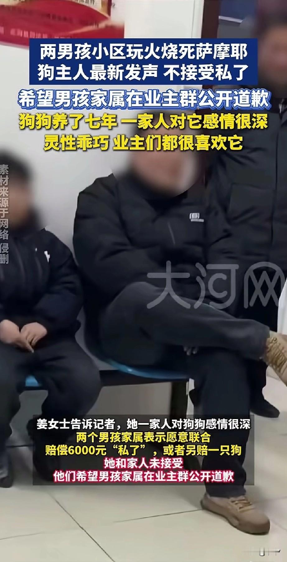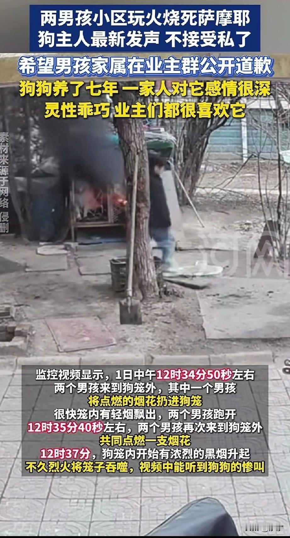 江苏连云港两个男孩在小区玩烟花,居然将点燃的烟花扔进了小区的狗笼里,里面住着一只非常可爱的萨摩犬! 物业监控显示两个小孩来到狗笼外,其中一个小孩将点燃的烟花扔进了狗笼,很快,狗笼子有烟雾飘出! 两个小孩跑开了,不到1分钟之后,两人又回来了,共同点燃了一支烟花,又扔进了狗笼子, 他们或许觉得这比较好玩,但是里面可住着一只可爱的小狗,业主们都非常喜欢他,它的主人养了它7年! 不到1分半的功夫,狗笼串起了火苗,监控视频里可以看到狗狗在绝望的叫喊,一场猛烈的大火直接将狗狗吞噬! 还真是活活将狗狗烧死了,真的实在太残忍,两个小孩子居然能这么狠,实在是不多见! 事情发生之后,该段视频被放上网络,迅速引起了网络热议,两个孩子的父母赶紧联系姜女士,表示愿意提出6000块钱私了! 或者给他换一只新的狗,但是都被狗主人江女士拒绝了,她看到这个视频心都碎了,狗狗明明什么错都没有犯,却被两个小孩子活活烧死了! 如今姜女士的愿望就是希望两个孩子在业主群公开道歉,毕竟这条狗非常有灵性,业主们都很喜欢! 大家对于两个小孩子放烟花烧死萨摩犬这事怎么看? 江苏宠物 萨摩犬 烟花乱扔 孩子放烟花惹祸