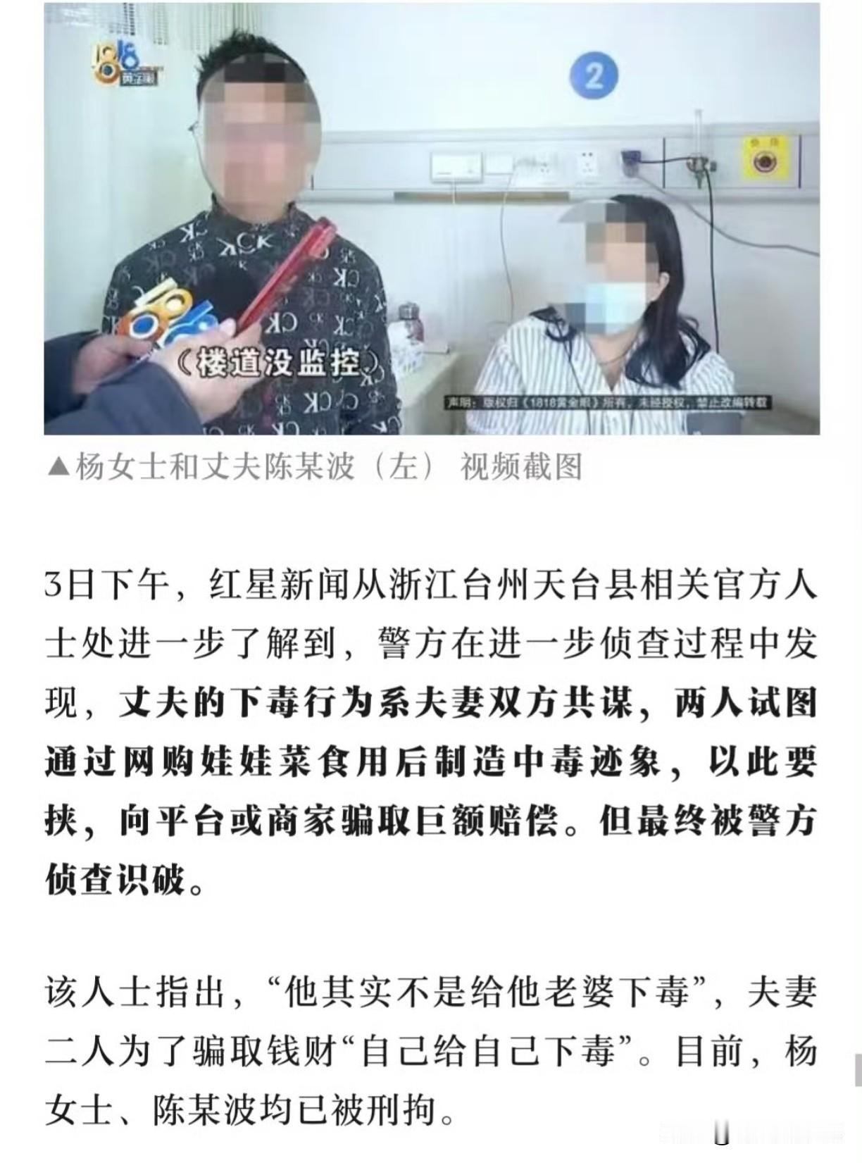 夫妻网购娃娃菜中鼠毒事件竟又有惊天大反转!第一次认识到什么叫做想钱想疯了! 浙江台州网购娃娃菜的两夫妻,食用后中毒,两人均进入ICU治疗。后警方查明是包裹娃娃菜的报纸有鼠毒,本以为事件到此已经真相大白了!接下来就是追究店家和提供报纸的人的责任了! 万万没想到啊,警方细查之下发现,竟然不是店家投毒,也不是报纸有毒,而是这一对再婚夫妻合谋下毒,意图骗赔!(待官方出通报) 2月3日澎湃新闻等报道,“是丈夫下毒”! 警方辟谣,“丈夫下毒消息不实!” 最后红星新闻援引官方,称“夫妻合谋骗赔!” 若真是这样,这俩人也太狠了,为了点钱对自己下这么狠的手!两个人治疗花去30多万,家里还有个未成年的女儿,最终不但骗不到钱,还得承担刑事责任,怎么看都不划算! 目前两人均已被刑拘,电话失联,孩子交由当地政府暂管。具体细节,调查结果和责任认定,还需等待官方通报!