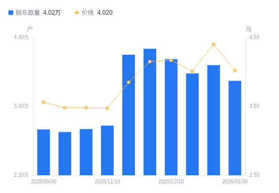 日期A股户数(户)流通A股户均持股数(股)户均持股市值(万元)2026-01-304020032618.0913.112026-01-204340030213.0613.292025-12-194170031444.7712.612025-12-104460029400.1612.262025-11-284670028078.0911.652025-11-204550028818.6211.102025-11-103110042162.2814.632025-10-313040043133.1315.012025-10-202980044001.5815.312025-09-303030743265.4815.40