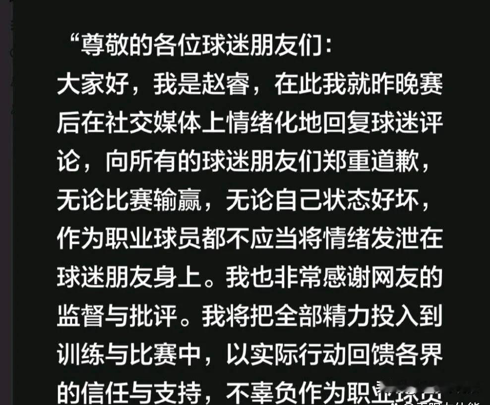 男篮队长赵睿深夜道歉,不应当将情绪发泄在球迷身上 中国男篮队长、北京北汽男篮球员赵睿于2026年2月2日就此前在社交媒体上对新疆球迷发表不当言论一事公开致歉,承认作为职业球员不应将情绪发泄在球迷身上,并承诺专注训练比赛。 事件背景与致歉原因 不当言论内容:赵睿在赛后回复IP属地为新疆的球迷留言时,使用了“回去打馕吧”等带有地域歧视的言论,引发广泛争议。 致歉动机:赵睿表示,无论比赛结果或个人状态,职业球员都需尊重球迷,此次行为违背了职业操守,因此通过微博发布正式道歉声明。 道歉声明核心内容 公开致歉对象:向所有球迷朋友郑重道歉,强调情绪化回复不可接受。24 整改承诺: 将全力投入训练和比赛,以行动回馈支持。 感谢网友监督批评,承诺履行球员使命。 后续影响与公众反应 纪律处罚:根据CBA联赛规定,赵睿预计将面临官方纪律处罚,具体措施尚未公布。34 舆论反馈:道歉声明发布后,其社交媒体评论区涌现大量支持性留言(如“睿哥加油”),显示部分球迷谅解其态度。北京男篮