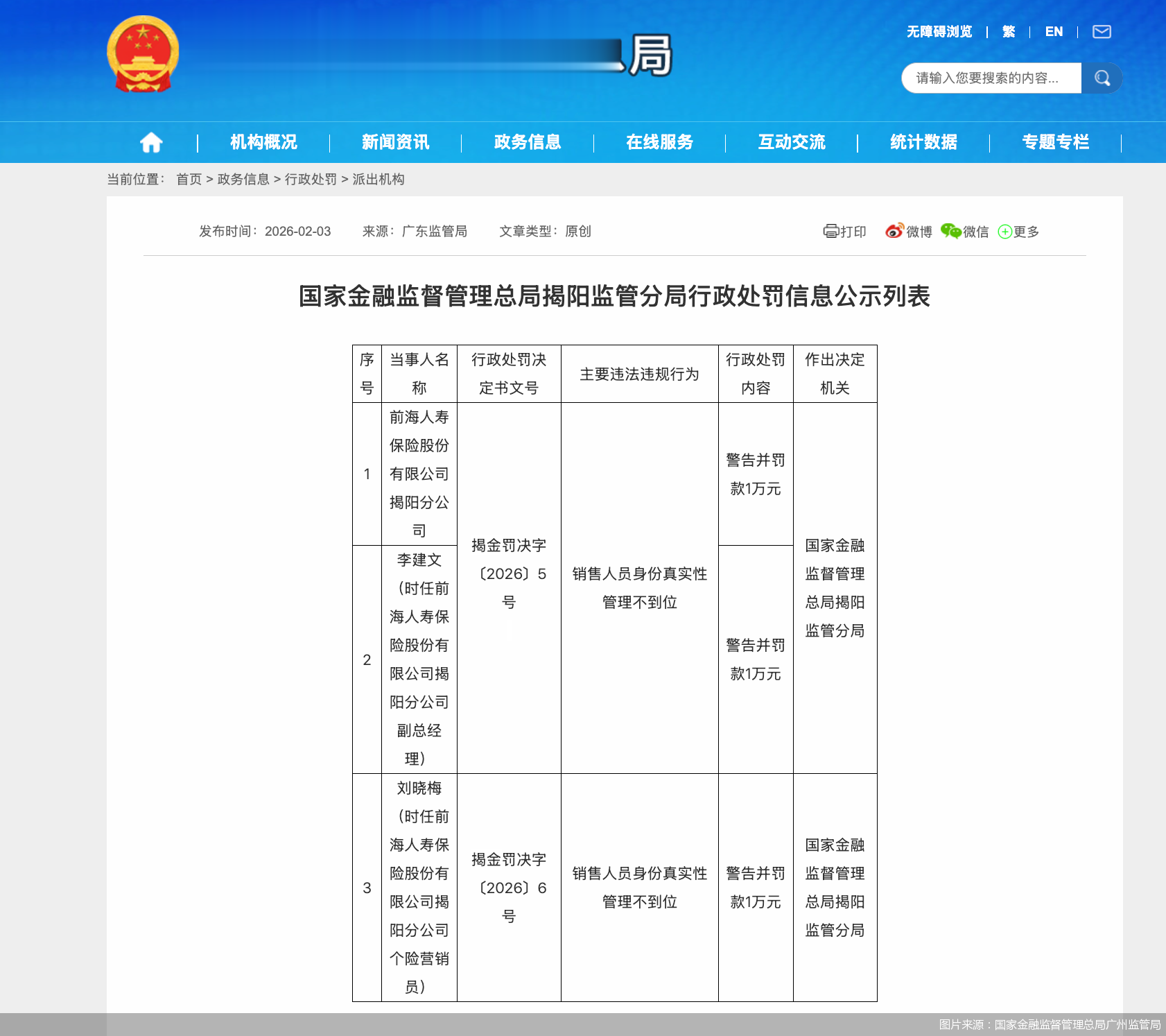 北京商报讯(记者胡永新)2月3日,国家金融监督管理总局揭阳监管分局发布的行政处罚信息显示,前海人寿保险股份有限公司揭阳分公司因销售人员身份真实性管理不到位,被警告并罚款1万元。时任该公司副总经理李建文被警告并罚款1万元,时任该公司个险营销员刘晓梅被警告并罚款1万元。