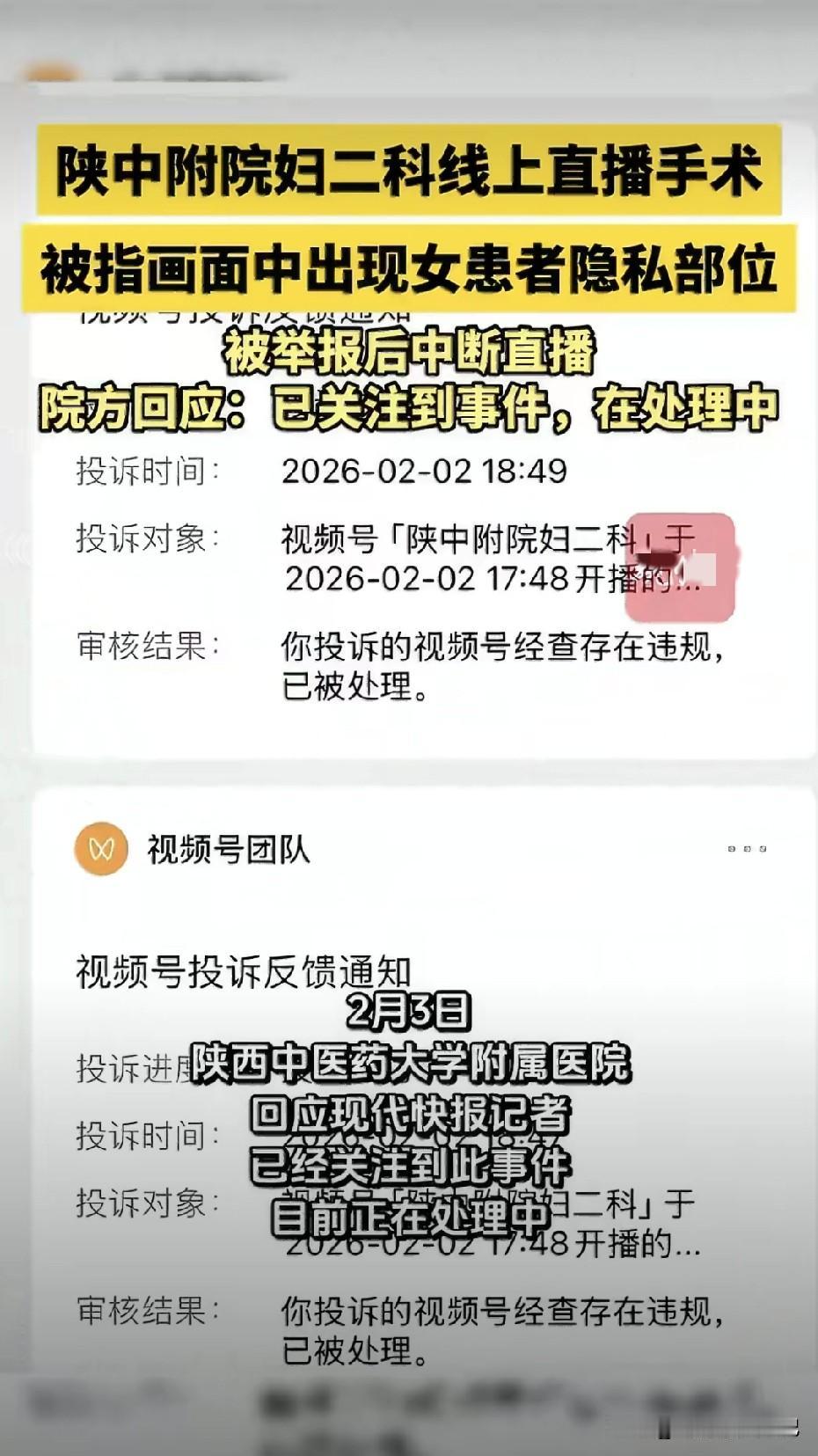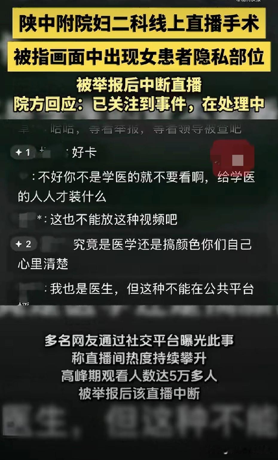 医院这波操作把医德按在地上摩擦,昨晚刷到这条新闻视频,陕西某医院做“教学直播”,镜头里竟出现女患者下半身隐私,弹幕还飘着恶臭黄腔,峰值5万人在线,这是上课?还是公开“医疗暴力”? 院方通报轻飘飘一句“内部视频误用公众平台”,处分俩人就完事。 患者连脸都没遮,万一被录屏截屏全网飞,她以后怎么做人?医护的“网络素养短板”,代价却要让一个普通姑娘用一辈子阴影去填,这账算得真精! 荒诞的是,网友连敲4次举报才掐断信号。医疗直播不是原罪,但无匿名、无打码、无知情同意,在我眼里就是赤裸的流量扒衣! 又把“学术”当挡箭牌,真正的教学轮不到吃瓜群众围观;也别把“创新”当遮羞布,失去底线的高科技,只是犯罪工具2.0版本。 最后,手术刀对准的是病灶,不是患者的尊严;镜头该记录的是医术,不是猎奇! 「图源:@中国新闻周刊」
