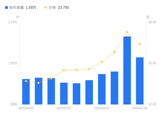 日期A股户数(户)流通A股户均持股数(股)户均持股市值(万元)2026-01-30158838944.4521.242025-12-31189387501.5719.552025-11-281381310284.8622.832025-10-311343710572.6521.522025-09-301253711331.6421.392025-08-291208411756.4322.022025-07-311218511658.9921.792025-06-301284811057.3418.852025-05-301290311010.2117.842025-04-301272211166.8618.48