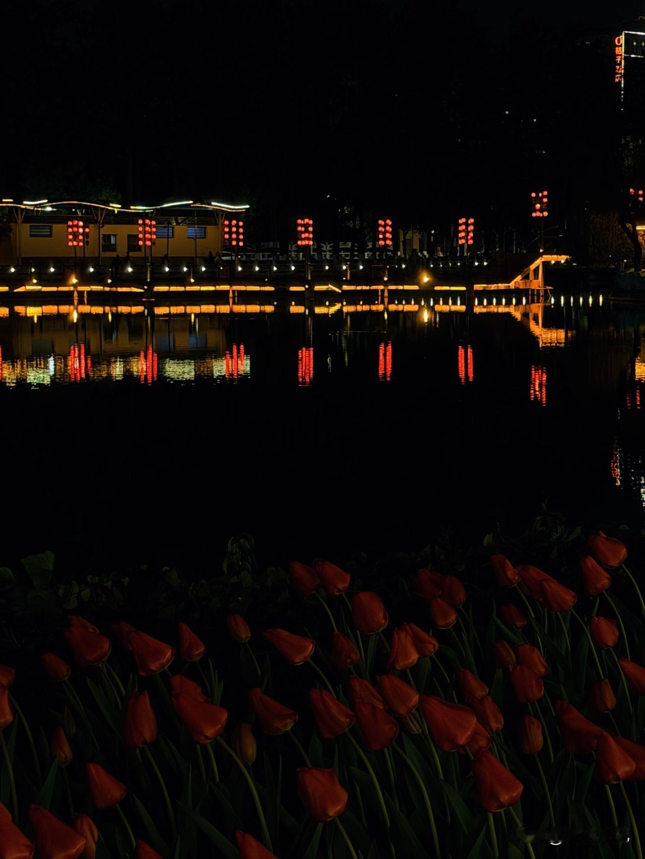 夜游翠湖,邂逅别样景致。灯影于水面涟漪间荡漾,搅碎一湖流光。 郁金香静立于岸旁,