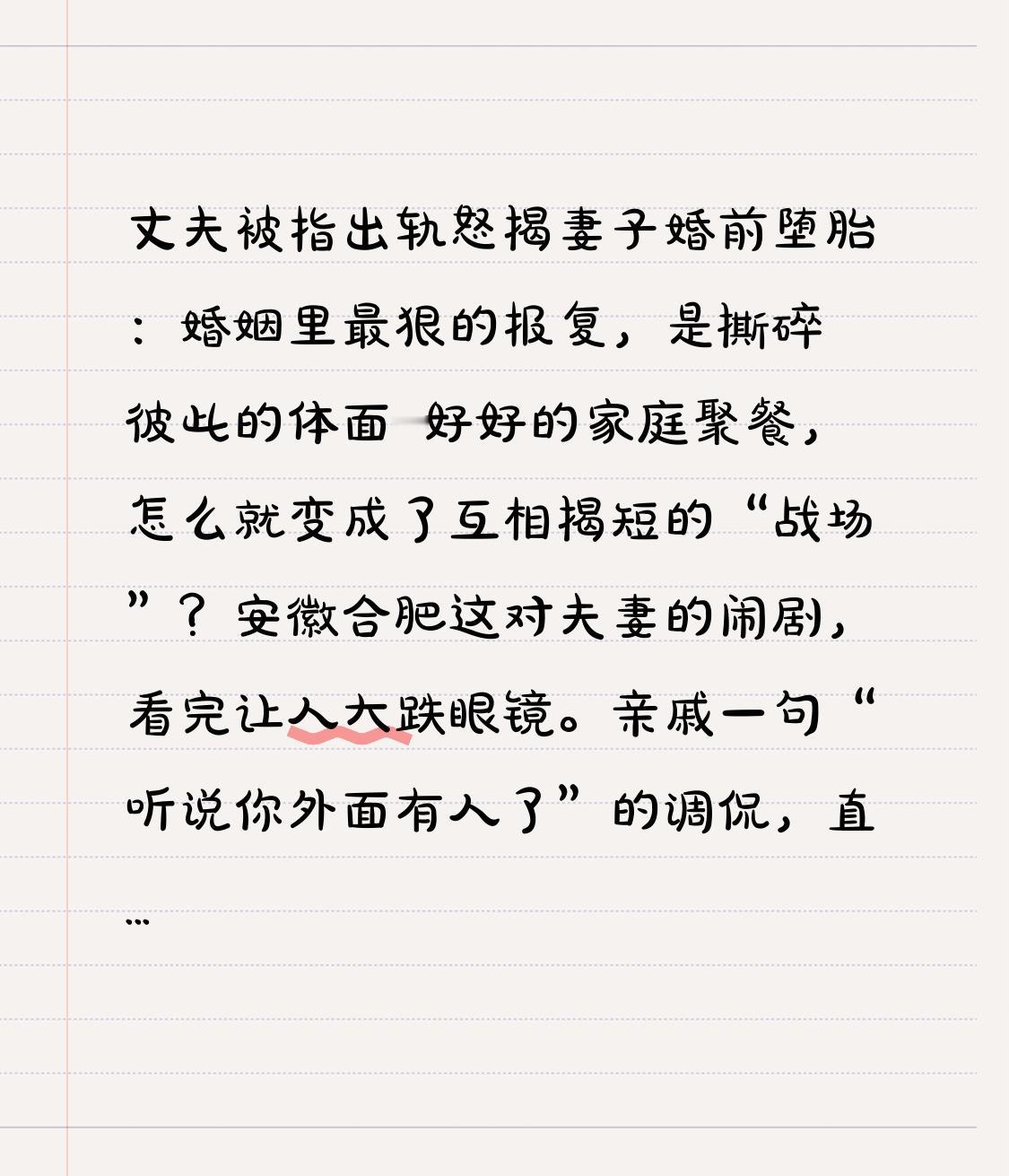 丈夫被指出轨怒揭妻子婚前堕胎:婚姻里最狠的报复,是撕碎彼此的体面 好好的家庭聚餐,怎么就变成了互相揭短的“战场”?安徽合肥这对夫妻的闹剧,看完让人大跌眼镜。亲戚一句“听说你外面有人了”的调侃,直接点燃了丈夫的怒火,可他没辩解半句,反而掏出手机摔在桌上,吼出的话让全场鸦雀无声:“我出轨?你们问问她,婚前跟别人怀了三次孕,打了两次胎,这些她敢说吗?” 事情的起因其实很简单。春节临近,双方亲戚聚在一起吃团圆饭,酒过三巡后,有亲戚半开玩笑提起“最近看到丈夫跟陌生女人逛街”,本是无心之言,却戳中了夫妻间早已存在的裂痕。丈夫这些年一直觉得妻子对自己有所隐瞒,加上近期两人频繁争吵,被当众质疑出轨后,情绪瞬间失控,当场翻出了藏在手机里的妻子病历照片。 照片里的诊断记录清晰显示,妻子在婚前确实有过两次人工流产史,还有一次自然流产。丈夫越说越激动,把妻子这些年的“秘密”全盘托出:“我当初求婚时,她跟我说自己是第一次恋爱,结果结婚后我才发现她跟前男友同居了三年!要不是我偶然翻到她的旧病历,这辈子都被蒙在鼓里!” 而妻子的反应更让人揪心,从最初的震惊到崩溃大哭,她捂着脸反驳:“那些都是婚前的事,我以为过去了就该翻篇!你出轨被人撞见,不认错反而拿我的过去当挡箭牌,你还是人吗?” 原来,妻子婚前曾有过一段刻骨铭心的感情,两次堕胎也是无奈之举,她一直不敢坦白,就是怕丈夫无法接受,没想到最后竟被丈夫在最亲近的人面前公之于众。 这场闹剧的转折点,在于一位长辈的怒斥:“你们俩是疯了吗?家丑不可外扬,就算有矛盾,也不能把这种隐私拿到台面上说!” 可此时的夫妻两人已经红了眼,丈夫继续翻出聊天记录,指责妻子婚后对自己冷淡,不孝顺公婆;妻子则反击,说丈夫早就跟女同事暧昧不清,多次夜不归宿,自己的隐忍都是为了孩子。 随着争吵升级,原本和睦的家庭聚餐不欢而散,亲戚们也陷入尴尬,纷纷提前离场。而这件事被传到网上后,瞬间引发热议。有人同情妻子:“婚前经历不该成为被攻击的武器,丈夫拿隐私报复太没品”;也有人站丈夫:“被欺骗多年心里肯定有疙瘩,出轨不对,但妻子隐瞒也有错”;还有人感叹:“婚姻里最可怕的不是有矛盾,而是撕破脸后,连最后一点体面都不给彼此留”。 律师也明确表态,丈夫公开妻子的病历和隐私信息,已经涉嫌侵犯隐私权,妻子有权要求其删除相关内容并赔礼道歉;而如果丈夫出轨情况属实,妻子在离婚时也可以要求损害赔偿。但无论谁对谁错,这场互撕最终伤害的,不仅是夫妻两人的感情,还有孩子的心理健康和两个家庭的和睦。 婚姻本是一场相互包容的修行,每个人都有过去,重要的是珍惜当下;遇到矛盾时,沟通才是解决问题的钥匙,而不是用最伤人的方式报复彼此。把对方的隐私当成攻击的武器,看似赢了争吵,实则输了感情,最后只会两败俱伤。 希望这对夫妻能冷静下来,好好想想自己真正想要的是什么。也愿所有夫妻都能明白,婚姻里的体面,不是给别人看的,而是留给彼此最珍贵的退路。你觉得这场闹剧谁错得更离谱?欢迎在评论区聊聊你的看法,觉得说得实在的,点个赞让更多人看到:婚姻不易,且行且珍惜!