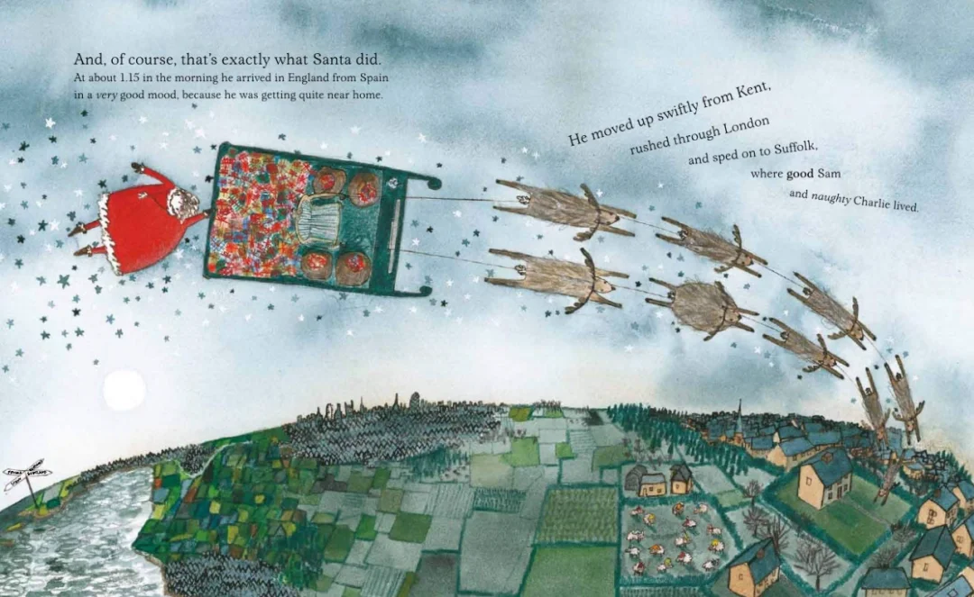 圣诞老公公在午夜时分驾着驯鹿雪橇来到小山和夏夏家。