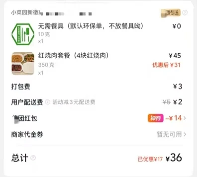 某团订单:套餐45元 + 打包费3元 + 配送费2元 - 神券14元 = 实付36元。预计送达:12:05。