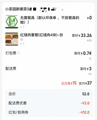 某宝某购订单:套餐45元 + 打包费1元 + 配送费3元 - 红包12元 = 实付37元。预计送达:12:10。