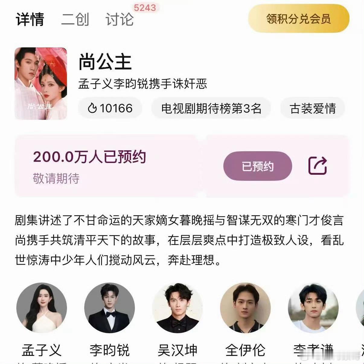 孟子义的一番女主剧尚公主刚杀青预约人数就破了200w大关,已经能预见到播出时的火