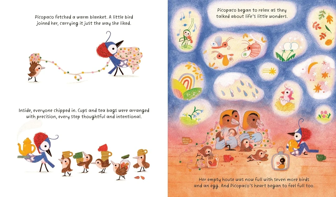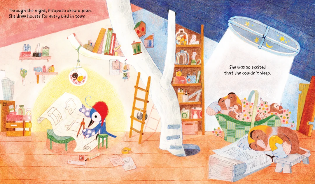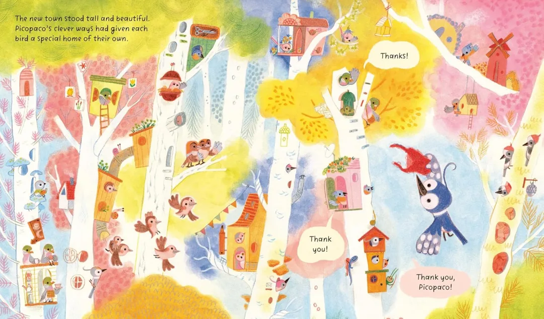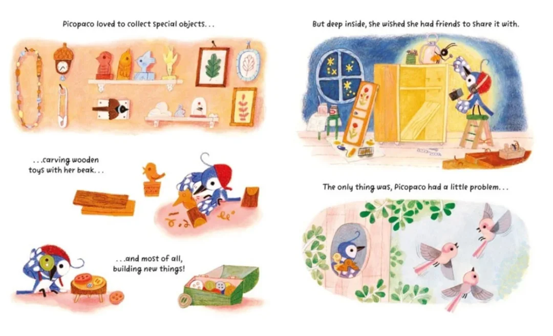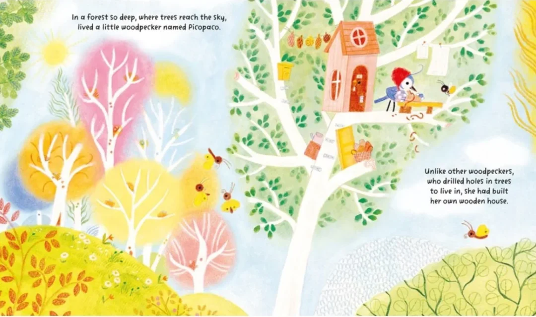 在树木高耸彷佛碰触到天际的森林里,住着一只名叫Picopaco的啄木鸟。Picopaco很特别,当别的啄木鸟都在树木上啄洞当巢穴,只有他盖了自己舒适的小木屋。Picopaco喜欢这里安静的生活,他不太喜欢啄木鸟群吵吵闹闹的声音,但有时他也觉得有点寂寞……