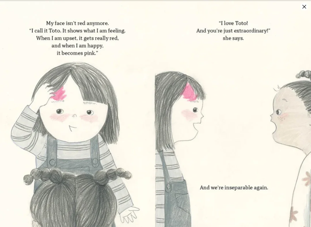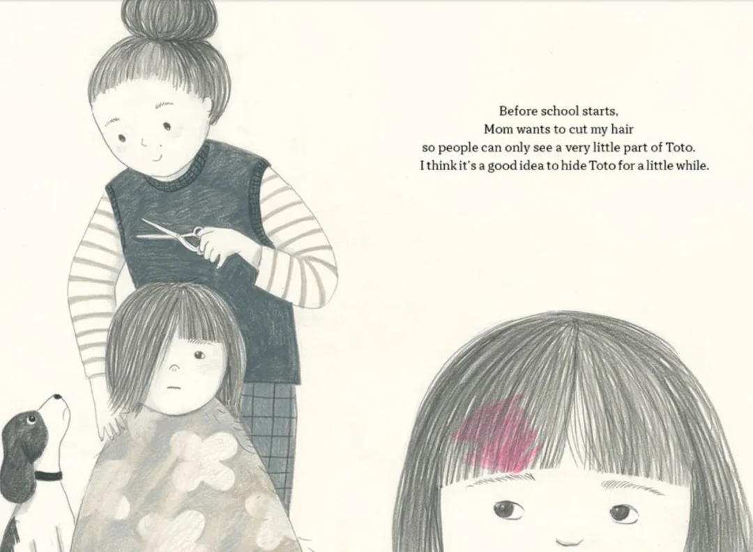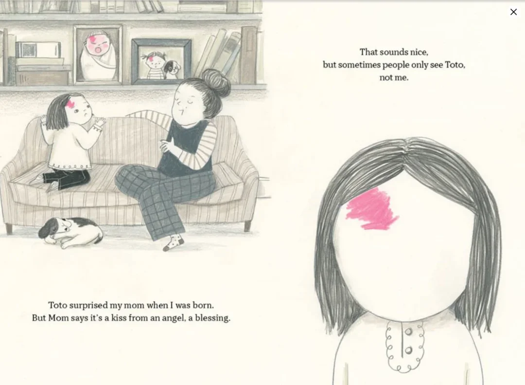 大多数时候,这个小女孩并不介意自己的胎记。她叫它 “托托”,妈妈说这是天使的吻痕。但有时候,人们似乎太过盯着托托看,以至于都忘了去关注小女孩本身。所以到了上学的时候,妈妈给她剪了刘海,至少暂时把托托遮住。