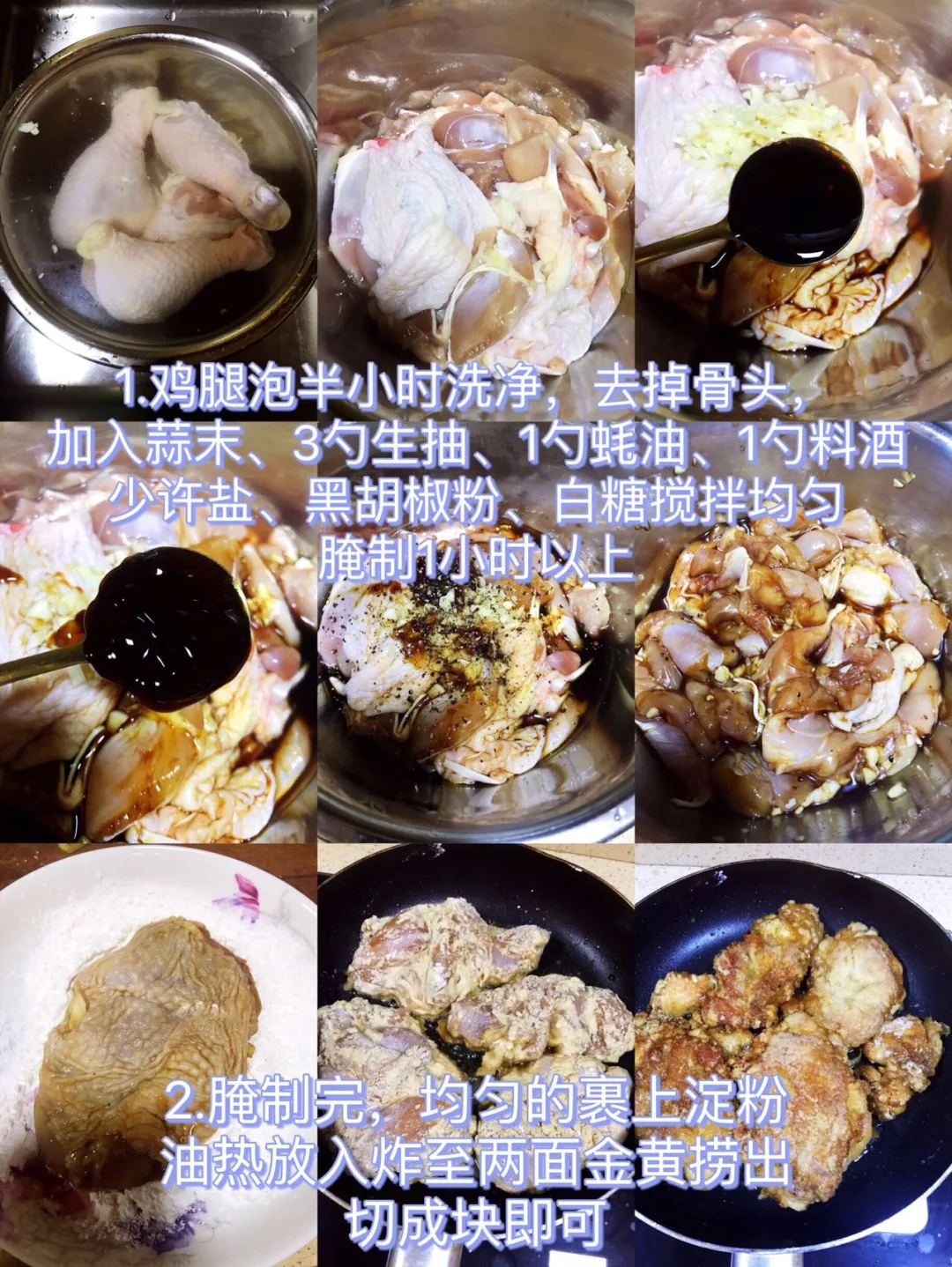 1⃣️鸡腿泡半小时洗净,剔掉骨头,加入蒜末、3勺生抽、1勺蚝油、1勺料酒;少许盐、黑胡椒粉、白糖搅拌均匀腌制一小时以上