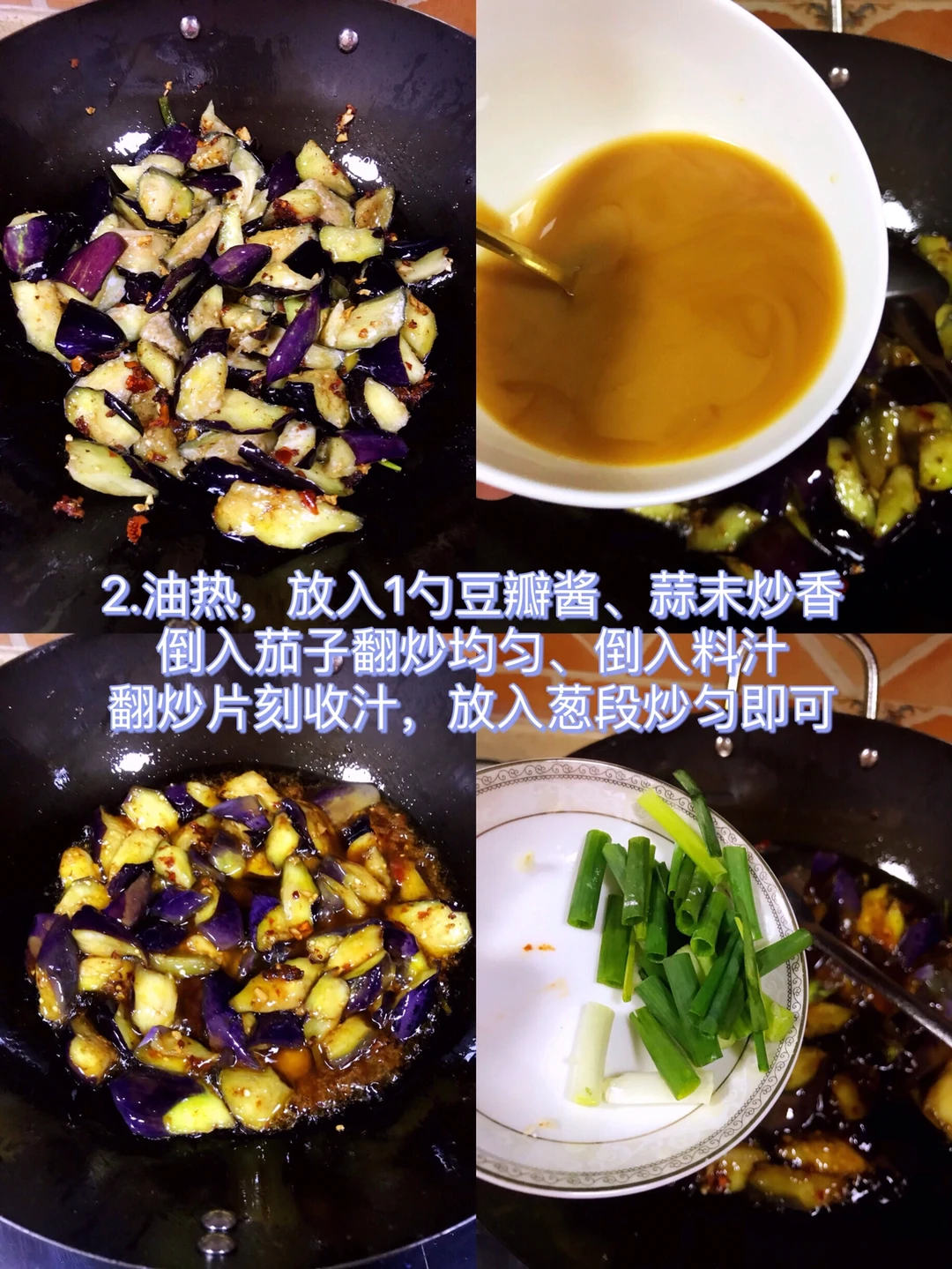 3⃣️油热(宽油),放入1勺豆瓣酱、蒜末炒香,倒入茄子翻炒均匀、倒入料汁,翻炒片刻收汁,放入葱段炒匀即可