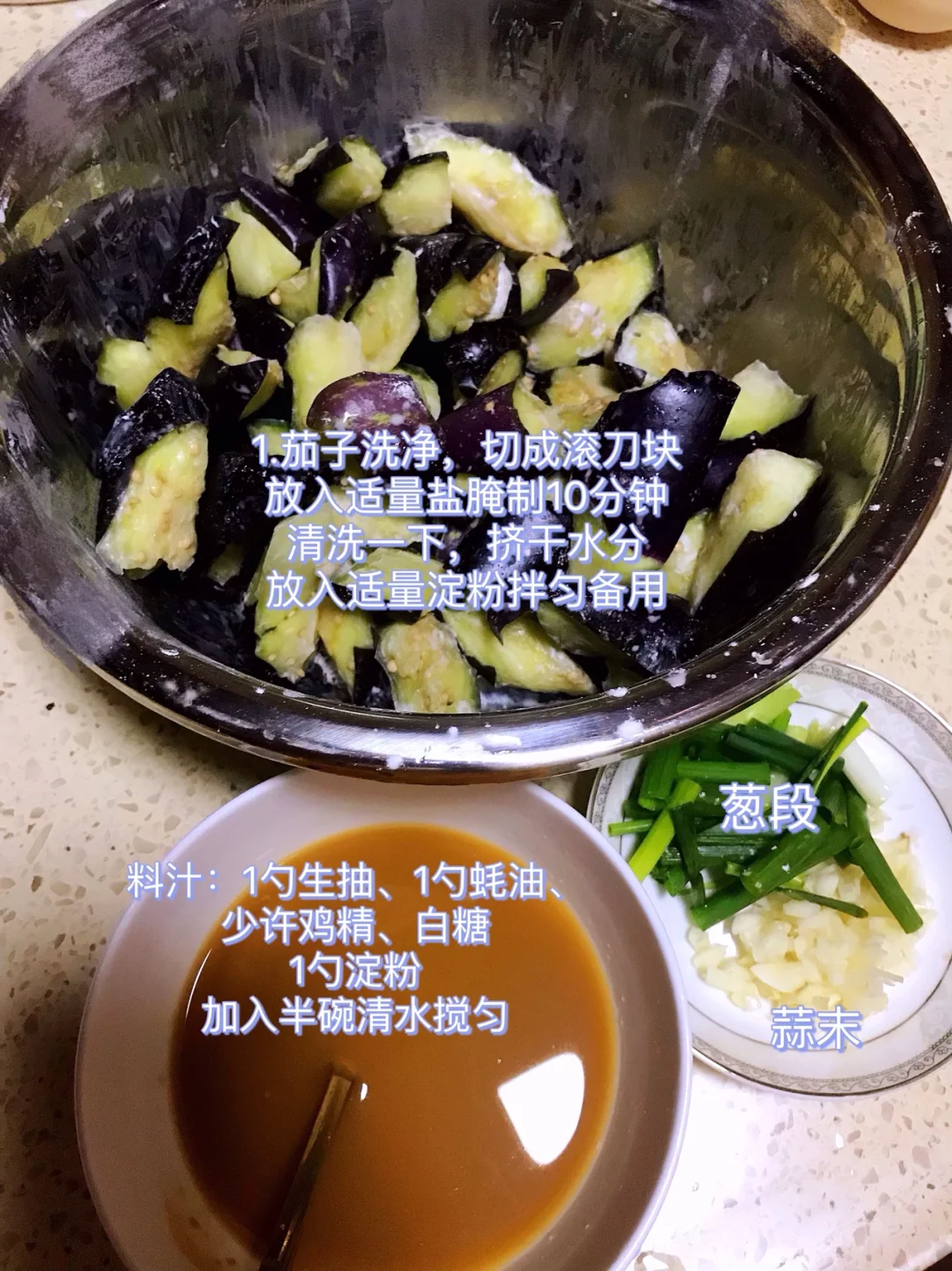 1⃣️茄子洗净切成滚刀块,放入适量盐腌制10分钟,清洗一下挤干水分,放入适量淀粉拌匀备用;葱切段,蒜切末
