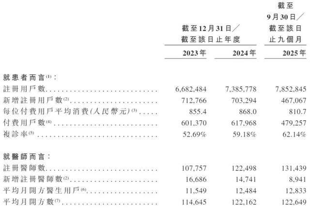 截至2025年9月末,“甘草医生”平台已连接中国13.14万名医师,月均开方医生为1.28万名,月均开方12.26万方;平台有785.28万名注册患者,其中付费用户47.93万名,平均消费810.7元,复诊率达62.14%。