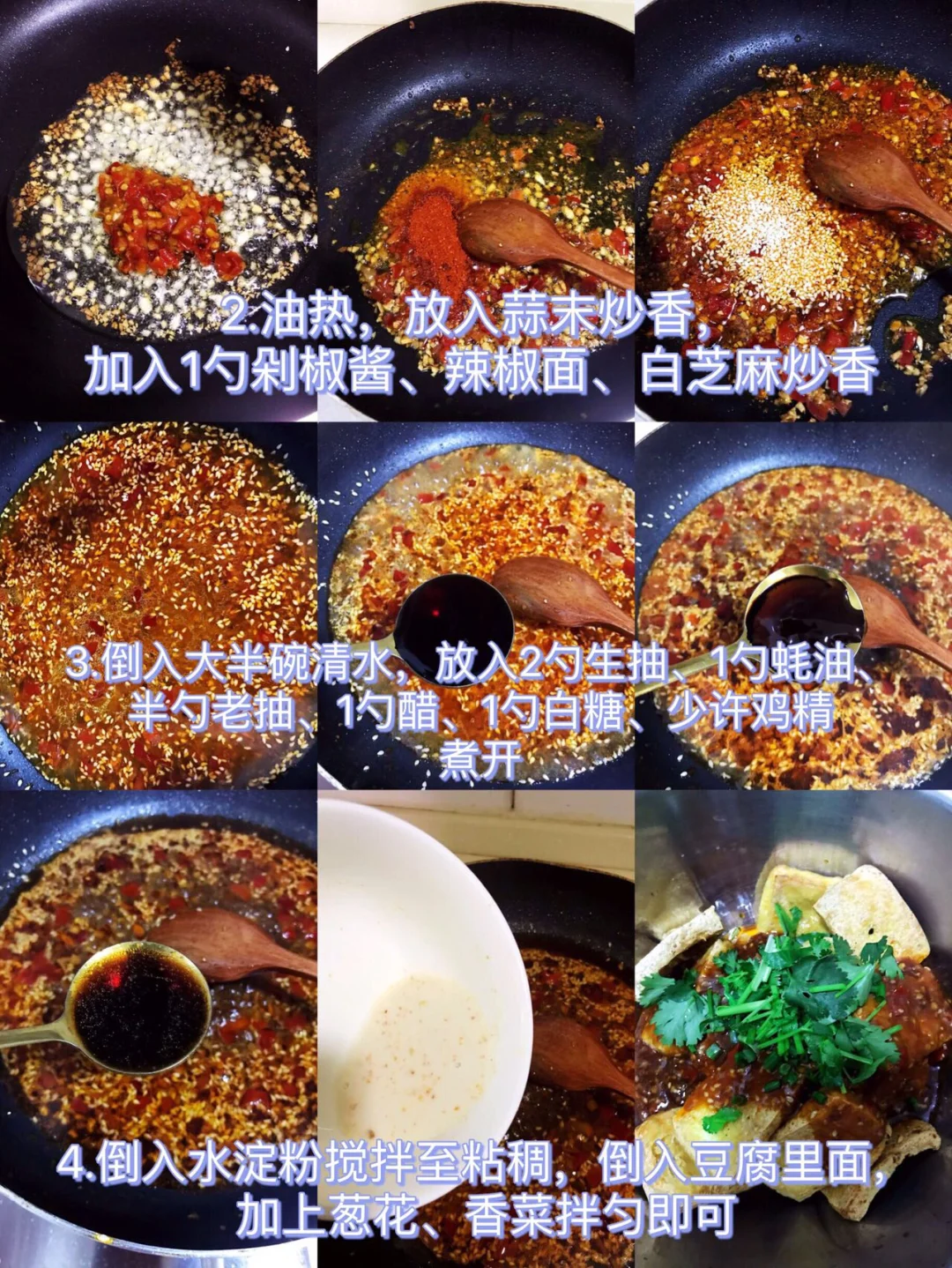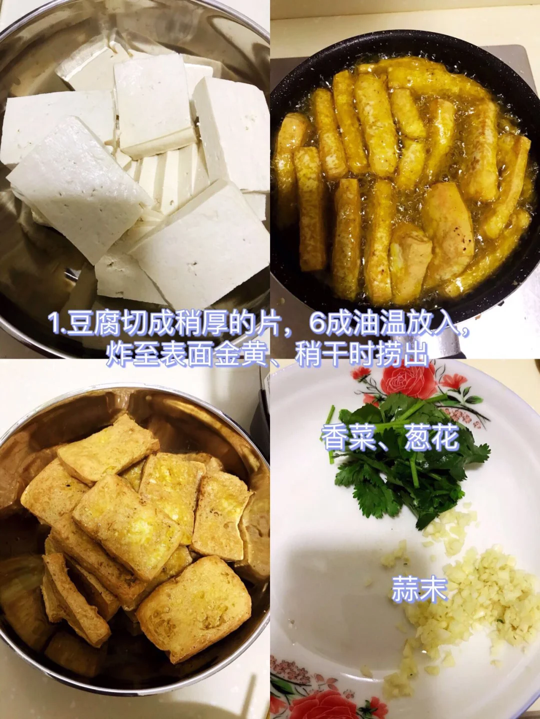 1⃣️豆腐切成稍厚的片,6成油温放入,炸至表面金黄稍干时捞出
