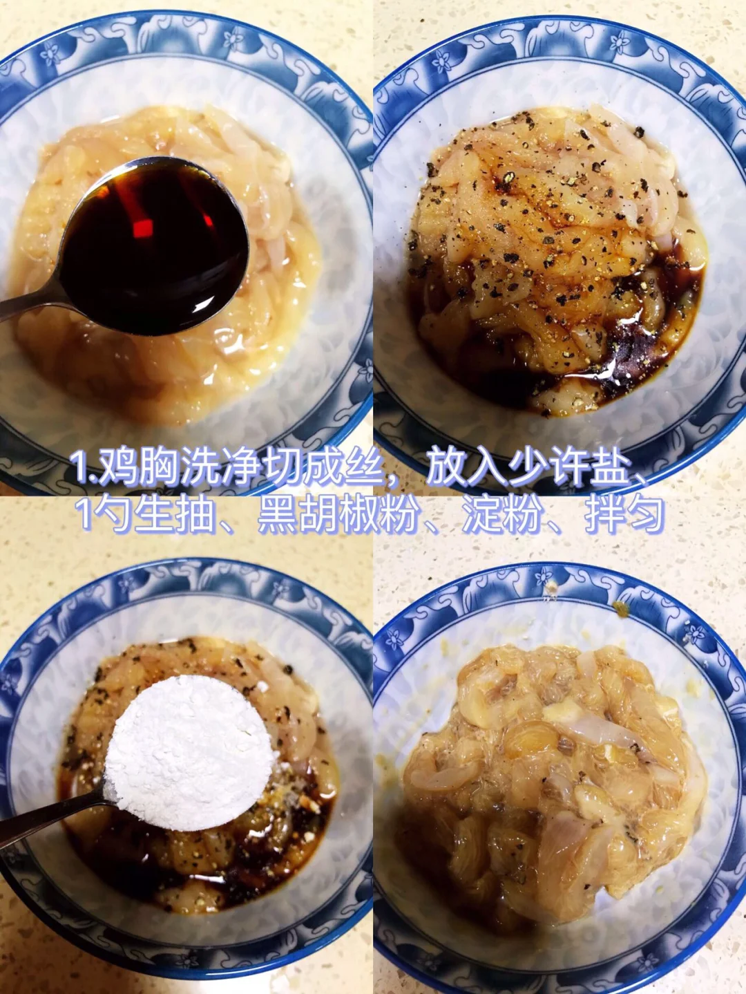 1⃣️鸡胸洗净切成丝,放入少许盐、1勺生抽、黑胡椒粉、淀粉拌匀