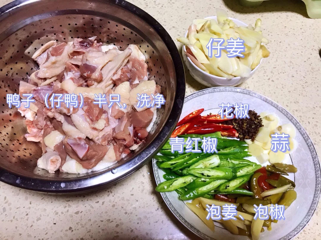 [赞R]食材:鸭子半只(仔鸭)、仔姜、花椒、青红辣椒、泡椒、泡姜、大蒜