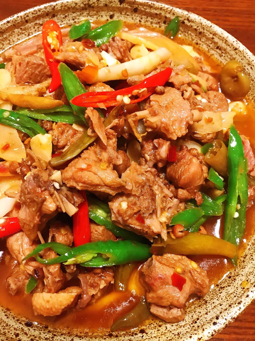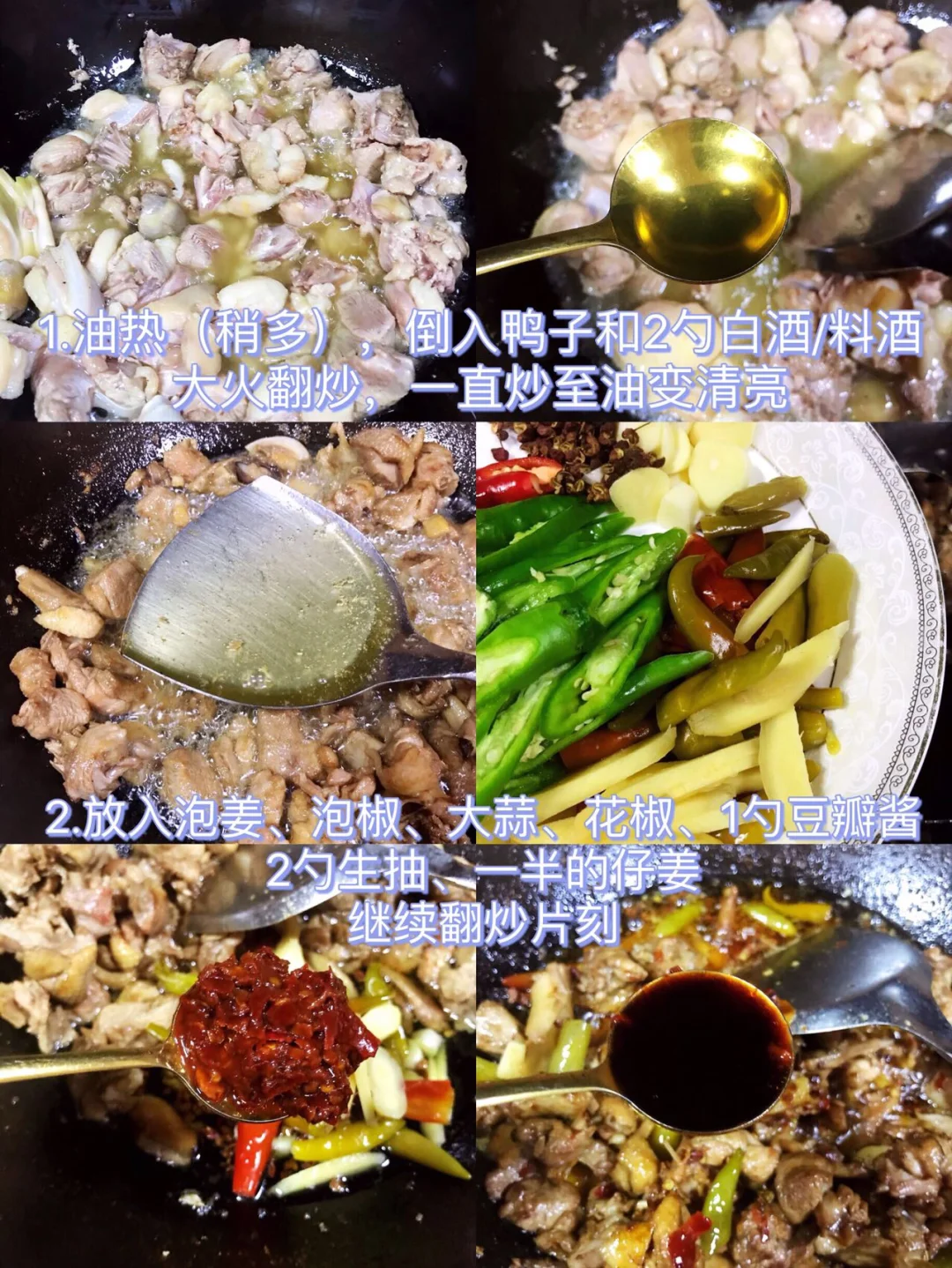 1⃣️鸭子洗净剁成小块;仔姜、泡姜泡椒、青红辣椒、大蒜切好备用;油热(油稍多),倒入鸭子和2勺白酒/料酒,大火翻炒,炒至油变得清亮
