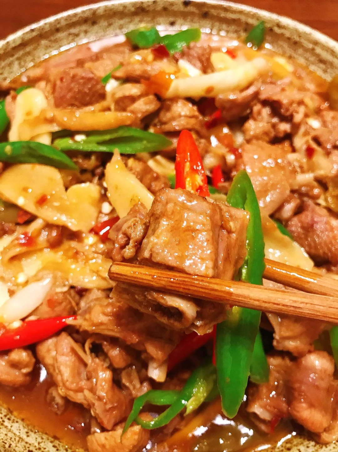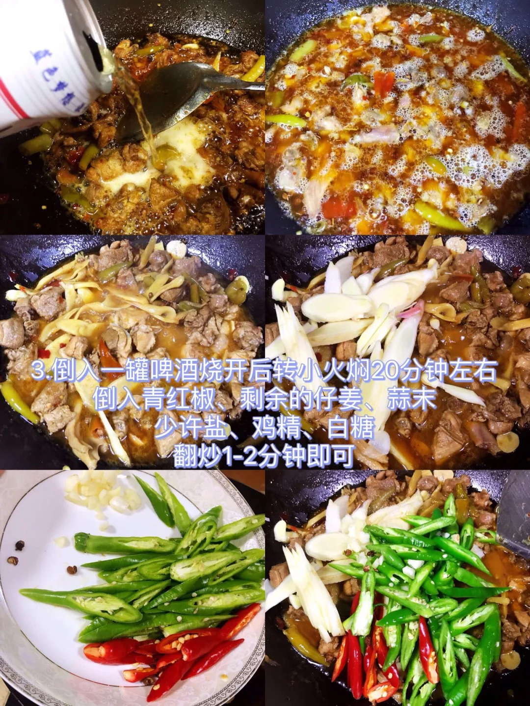 3⃣️倒入一罐啤酒烧开后转小火焖20分钟左右,倒入青红辣椒、剩余仔姜、蒜末,少许盐、鸡精、白糖翻炒1-2分钟即可