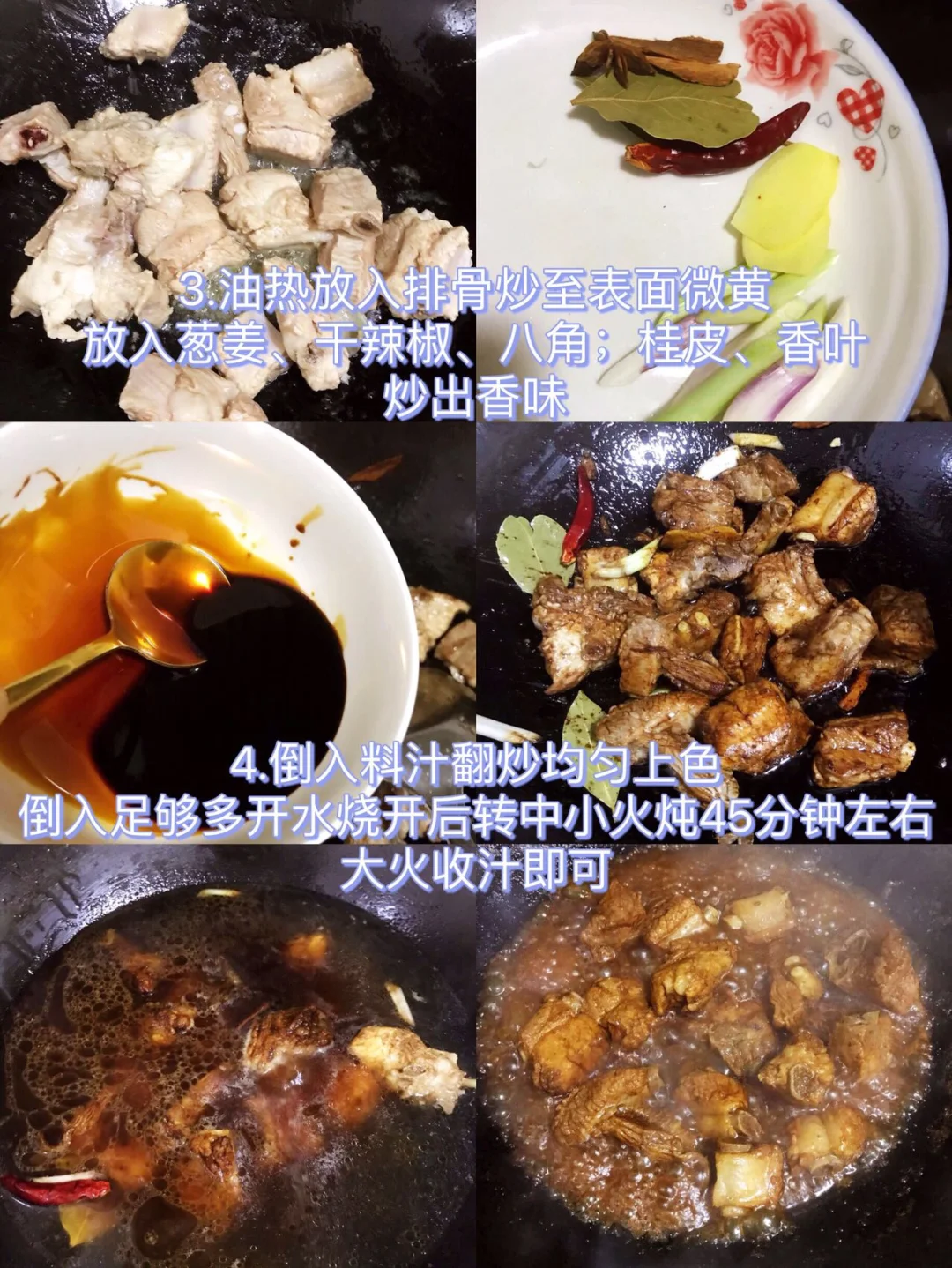 3⃣️油热放入排骨炒至表面微黄,放入葱姜、干辣椒、八角、桂皮、香叶炒出香味;倒入料汁翻炒均匀上色,倒入足够多开水烧开后转中小火炖45分钟左右大火收汁即可(注意:随时观察,不要将水烧干了喔)