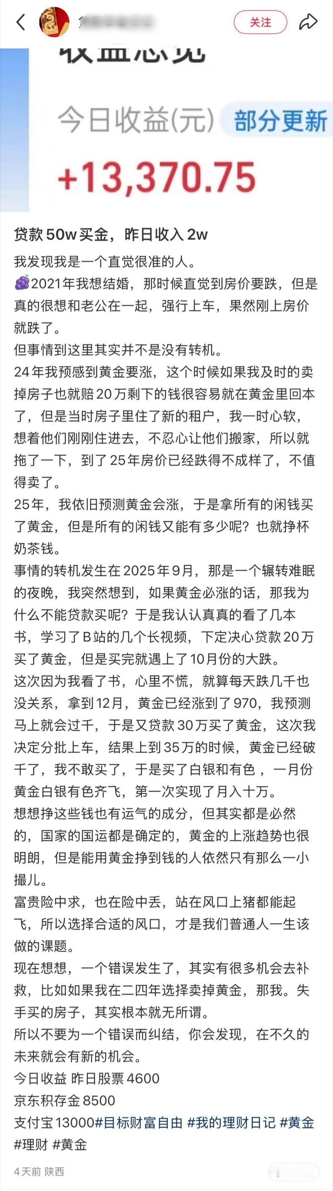 不理解这种没钱,去借钱也要炒黄金的,她说自己不是赌博,但借钱去买黄金这就是赌博啊