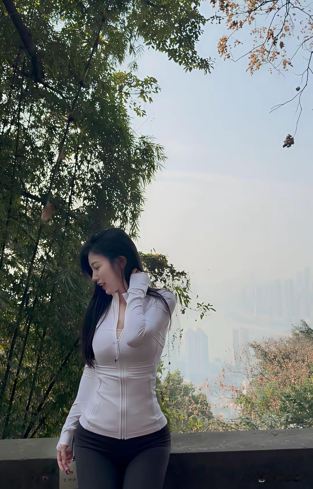 山风掠过发梢,她站在崖边,身后是层叠的黛色山峦与翻涌的云。冲锋衣的拉链在风里轻响