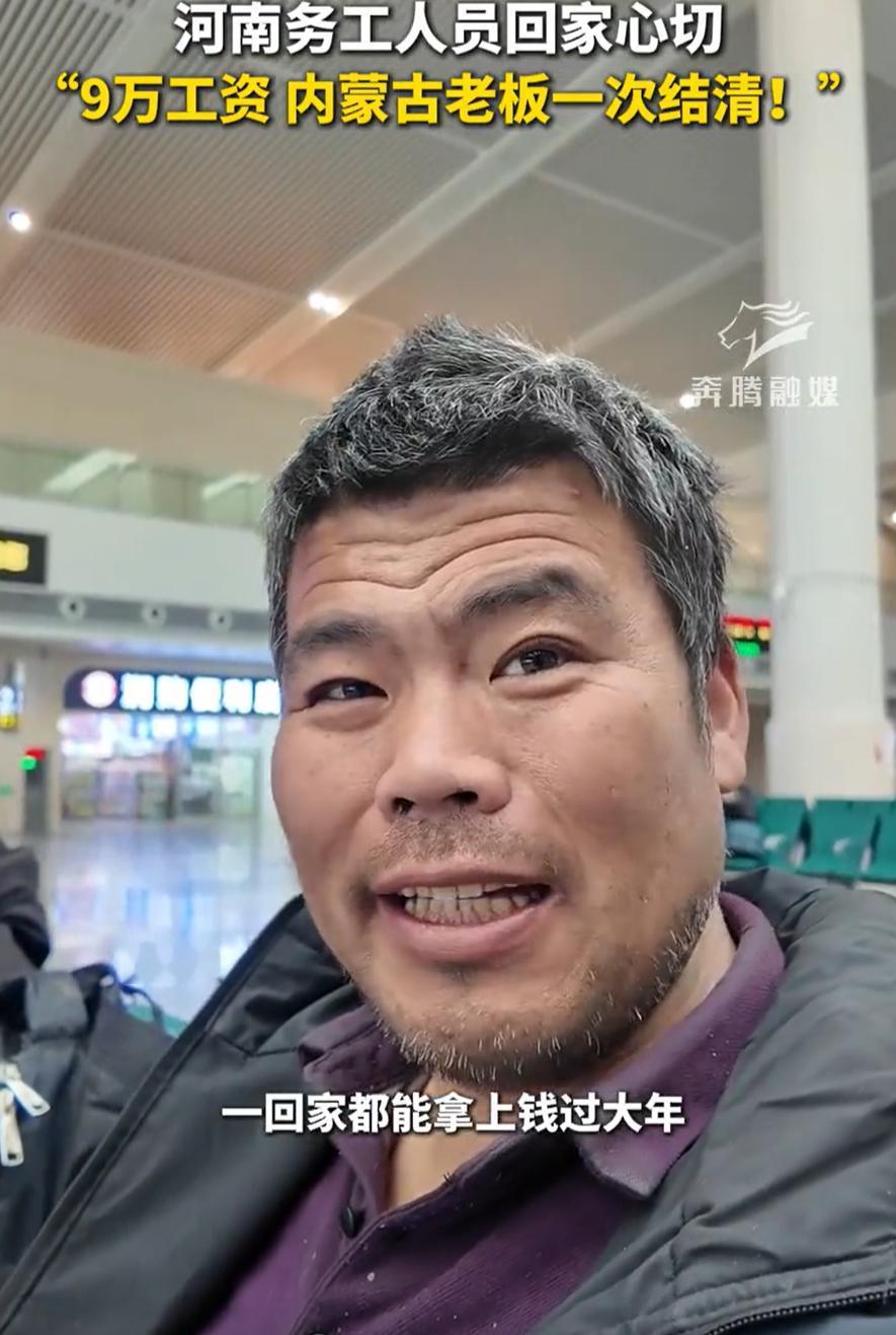 春运第一天,记者在火车站看到一名准备坐车回家过年的务工人员,结果万万没想到,大哥接受采访时两句话,竟然把自己的内蒙古老板给带火了,一句90000元工资一次性结清,让不少人看的羡慕不已 能看出来这位大哥心情不错,本来买的是第二天的车票,但实在是等不及了,改签到前一天准备回河南老家过年 他说,自己是在工地上干活的,而自己之所以能开开心心的回家过年,还要归功于他们的内蒙老板,年底把工资一次性结清了,今年一年拿了90000块,这次回家能好好过个大年了 网上有人看到这段,感叹说现在能按时结清工钱的老板,真的难得。不拖不欠,到年底让工人带着钱回家,这份实在,比什么承诺都强 确实如此,就凭工资结清这一件事,就能看出是个靠谱的人。工地干活不容易,风吹日晒,出力流汗,最后盼的就是顺利拿到工钱回家。老板能做到这一步,工人心里暖和,干起活来也踏实 其实老百姓的要求真不高,干活拿钱,天经地义。但就这么一件理所应当的事,有时候却成了盼头。大哥能笑着回家,是因为老板守住了这份基本的承诺 咱们身边总有这样的小事,不大,却暖人。一个老板按时发工资,一个工人踏实干活,最后大家都能好好过年。这种简单的良性循环,其实正是最扎实的温暖 日子不就是这么过的么?你对我好,我对你好,大家都守本分,社会就多了份人情味。那位内蒙老板未必想到自己会被这么多人称赞,他只是做了该做的事,但恰恰是这份本分,让人觉得可贵