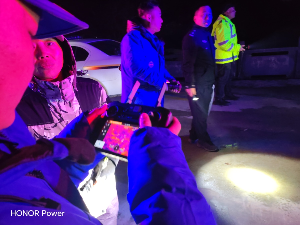 6支强光手电在密林中织成搜救光网,8台对讲机实时联动,热成像无人机在空中持续扫描。面对陡峭的山势和茂密的植被,队员们相互搀扶,顶风冒寒搜寻。历经5小时艰苦攻坚,2月2日凌晨4时40分,两名被困群众被成功找到。经检查,两人仅因低温略有乏力,无生命危险。