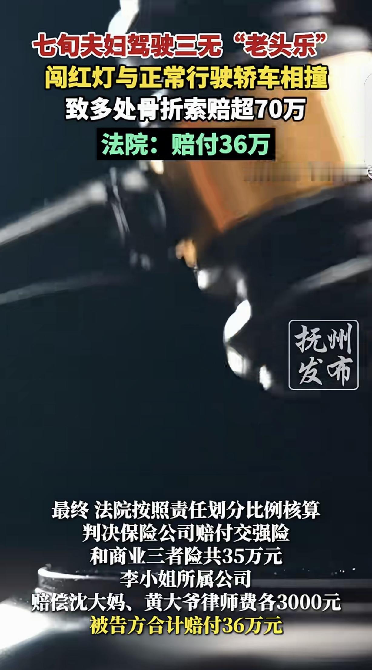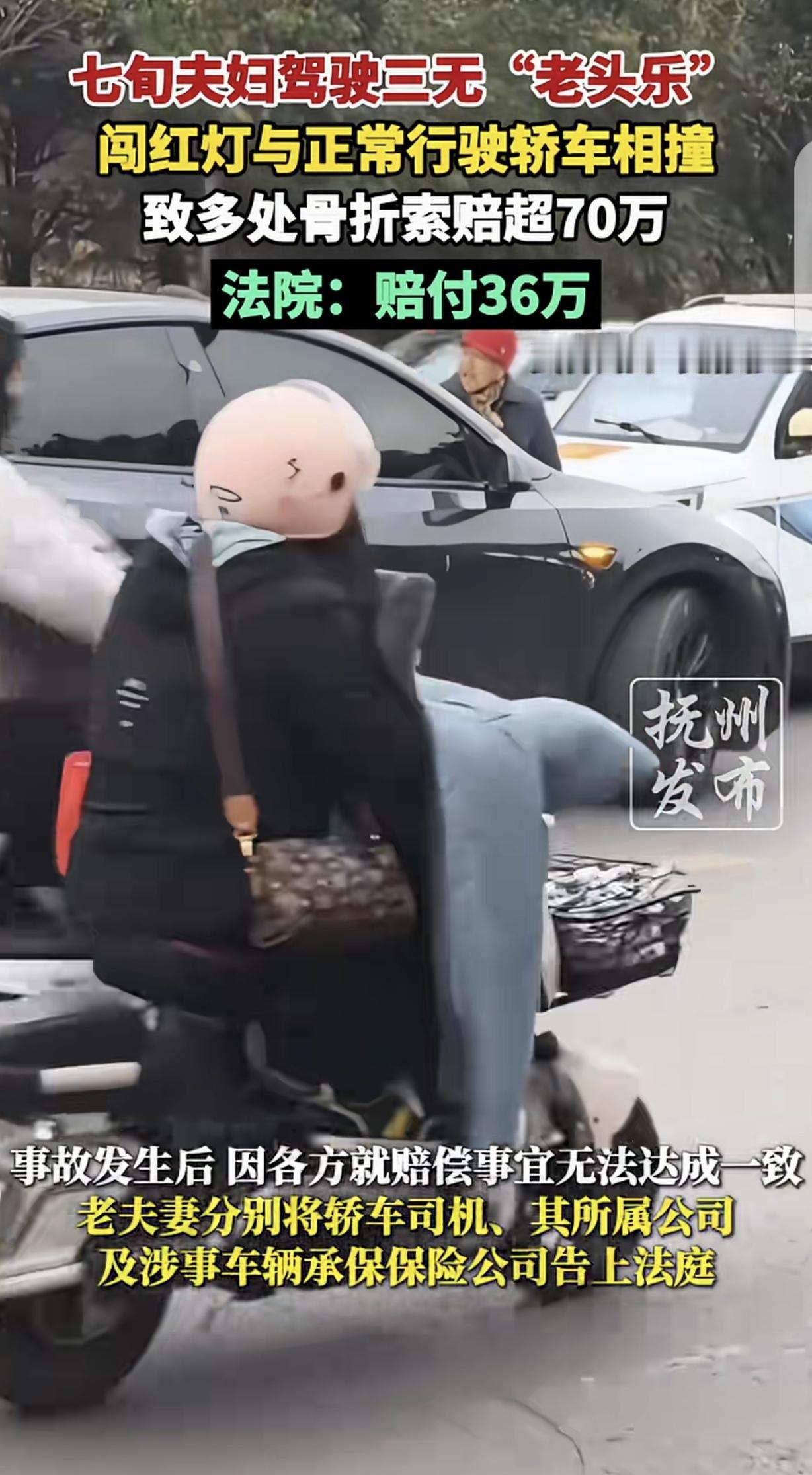 上海,一70多岁老两口,开着三无“老头乐”在马路上横冲直撞闯红灯,跟一女子正常行驶的轿车相撞,老两口多处骨折,一纸诉状把女子告上法庭索赔70万,法院认为女子在绿灯通行时没减速,需要承担责任,赔付36万。女子崩溃了:闯红灯有理了? 一天,李女士像往常一样,开着车正常行驶在马路上。她严格遵守交通规则,看着绿灯亮起,便稳稳地踩下油门,继续前行。 可谁能想到,危险正悄然逼近。沈大妈和黄大爷这对70多岁的老两口,开着一辆毫无安全保障的三无“老头乐”,在马路上横冲直撞,完全无视交通信号灯,径直朝着李女士的车冲了过来。 “砰”的一声巨响,两车狠狠地撞在了一起。巨大的冲击力让李女士的车猛地一震,她惊恐地瞪大了眼睛,脚踩刹车,双手死死地握住方向盘。 而沈大妈和黄大爷的老头乐瞬间变了形,两人也被狠狠地挤在车里,痛苦地呻吟起来。 很快,救护车和交警都赶到了现场。沈大妈和黄大爷被抬上救护车时,嘴里还不停地骂骂咧咧,指责李女士开车不长眼。 他们似乎完全忘记了自己闯红灯的恶劣行为,仿佛自己才是受害者。在医院里,老两口更是撒泼打滚,声称自己浑身疼痛难忍,要求李女士赔偿巨额损失。 李女士看着眼前这一幕,又气又委屈。她明明按照交通规则正常行驶,却遭遇了这样的无妄之灾。 她反复跟交警解释:“我是绿灯通行,他们闯红灯啊!”可交警却告诉她,虽然对方闯红灯有错,但她在绿灯通行时没有减速观察,也需要承担一定责任。 之后,沈大妈和黄大爷一纸诉状将李女士、她所在的公司以及保险公司告上了法庭,索赔70万。 法庭上,老两口依旧不依不饶,坚称是李女士的过错导致他们受伤,要求高额赔偿。 李女士满心无奈和不服气,她觉得自己太冤了。她遵守规则开车,却要为别人的违法行为买单。 最终,法院按照责任划分比例核算,判决保险公司赔付交强险和商业三者险共35万元,李女士所属公司赔偿沈大妈黄大爷律师费各3000元,被告方合计赔付36万元。 这个结果让李女士崩溃了,她忍不住质问:“闯红灯有理了?”她不明白,为什么明明是对方的错,自己却要承担这么大的责任? 这场事故,不仅让她在经济上遭受了损失,更在心理上留下了深深的创伤。 有人说,按交通法论事,无牌无路权、闯红灯出事故的车及其车主,就该是全责,正常行驶的车及车主就不应该赔偿。此事的判决与交通法不符。 闯红灯应该全责至少80的主责,不是这样的和稀泥。我经常遇到过马路的老头老太太,老远就开始鸣笛都不为所动明明走路动作很正常,就是慢悠悠走他的,也不管机动车会不会撞到他,无语得很。 而沈大妈和黄大爷,或许还在为自己的“胜利”沾沾自喜,却丝毫没有意识到自己的错误行为给别人带来了多大的伤害。 这事儿判得确实让人堵得慌。按常理说,闯红灯撞车的才是全责,凭啥守规矩的人还要出钱? 但仔细想想,法律和情理有时候确实会有点偏差。不过法院判李女士担责也不是毫无依据,毕竟开车过路口的时候,即便绿灯亮着,也得减速观察,留足反应时间。 可这老两口也太离谱了,闯了祸还恶人先告状,好像全世界都得惯着他们。 而且那“老头乐”本身就是三无产品,完全不应该上路,出事了反倒是受害者倒打一耙,这也太欺负老实人了。 说到底,还是得管好老头乐上路的问题,不然这种好人被冤的事儿还得发生。 根据《道路交通安全法》第38条,车辆、行人应当按照交通信号通行。 沈大妈夫妇驾驶三无“老头乐”闯红灯,违反了道路交通安全法的规定,对事故发生存在主要过错。 同时该法第44条规定,机动车通过交叉路口,应当减速慢行。 李女士绿灯通行时未减速观察,没尽到安全驾驶义务,存在次要过错,因此法院判决双方按责任划分承担损失,保险公司在交强险和商业三者险范围内赔付35万元,李女士所属公司赔偿律师费6000元。 对此,你怎么看?