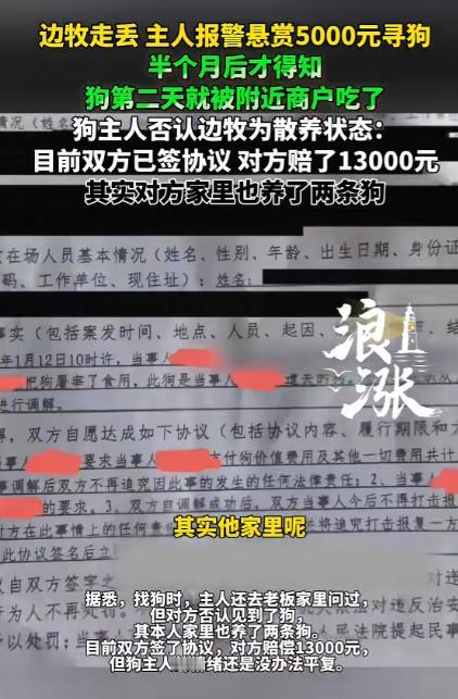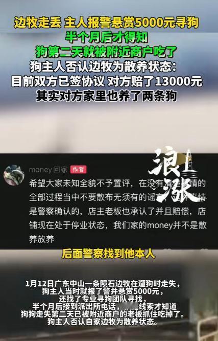 太坏了!广东中山,一狗主人养的一只陨石边牧走失,主人因此悬赏5000元寻找。不料半个月后才知,狗子走失第二天,就被附近一商户老板给吃掉了。关键是,主人不但与老板认识,这老板也知道狗是主人养的,而且老板也养着两只狗,但万万没有想到的是,老板爱狗却还要吃狗! 广东中山最近出的这档子事,能让所有养宠物的朋友瞬间火冒三丈还心头发寒,这只陨石边牧可不是普通的狗狗,作为边牧里的稀有品种,它有着犬界排名第一的智商。 能读懂主人的各种手势和语气,身上的毛发还带着独特的陨石纹理,颜值和灵性都格外出众,对主人来说,它早就不是一只宠物,而是朝夕相伴的家人。 1 月 12 日,当天主人带着这只陨石边牧出门遛弯,全程都没有放任狗狗独自乱跑,更不是网传的散养状态,只是在河边的开阔地带短暂解绳,让狗狗能自由活动一会儿,自己也一直守在旁边,可就是这一转眼的功夫,狗狗就没了踪影。 发现狗狗走失后,主人第一时间就慌了神,立刻在周边呼喊寻找,找了许久都没有任何回应,当下就选择了报警,把狗狗的品种、外貌、走失的时间和具体位置都详细告知了民警,希望能借助警方的力量找到狗狗。 为了能让更多人留意到自家的陨石边牧,主人还当即发布了 5000 元的悬赏信息,只要有人能提供有效线索找到狗狗,就愿意兑现这笔赏金。 不仅如此,主人还专门花钱聘请了专业的寻犬团队,和团队的工作人员一起展开地毯式的寻找,他们印了上百张寻狗海报,上面清晰印着陨石边牧的照片和主人的联系方式。 那段时间里,主人几乎推掉了所有的事情,每天天不亮就出门,沿着走失的区域一遍遍转悠,喊着狗狗的名字,哪怕是深夜,也会打着手电筒在附近仔细搜寻,心里始终抱着一丝希望,觉得自家的狗狗只是走丢了,很快就能找回来。 周边的街坊邻居看到主人焦急的样子,也都帮忙留意,可十几天过去,始终没有任何关于这只陨石边牧的消息,主人的心里既着急又忐忑,却从来没有想过要放弃。 在寻找的过程中,主人想到了附近的一位商户老板,两人平日里算是认识,偶尔碰面都会打个招呼,主人还曾经带着自家的陨石边牧,去这位老板的店门口和他养的两条狗一起玩过,老板明明知道这只陨石边牧是自己养的,也清楚狗狗的样子。 抱着一丝希望,主人特意去了老板的家里询问,当时老板在家,面对主人的询问,一脸坦然地表示自己压根没见过这只陨石边牧,还安慰主人别太着急,说狗狗说不定只是跑远了,总会找回来的。 听到老板的话,主人当时还放下了心里的一丝怀疑,想着既然认识的人都没看到,那就继续去别的地方寻找,完全没有想到,自己苦苦寻找的狗狗,其实早就已经被这位老板处理了。 就这样找了整整半个月,主人几乎把周边的区域翻了个底朝天,花了不少的时间和金钱,心里的希望也一点点被消磨,就在他几乎要绝望的时候,突然接到了派出所的电话,说有了自家陨石边牧的线索,让他立刻过去一趟。 接到电话的那一刻,主人心里满是欢喜,以为终于能找到狗狗了,可赶到派出所后,民警告知的消息却让他瞬间懵了,民警通过调取周边的监控视频,找到了明确的线索,自家的陨石边牧在走失的第二天,就被这位商户老板抓住了。 而且老板在抓住狗狗后,很快就将其宰杀食用了,监控画面里,能清晰看到老板用香肠引诱狗狗,然后迅速用绳子套住狗狗的脖子,拖着进了后院,整个过程不过短短几分钟。 得知真相的主人,怎么也不敢相信这样的事实,他再次明确向警方和相关人员表示,自家的陨石边牧从来都不是散养状态,平时遛狗都会全程牵绳,只是事发当天短暂解绳让狗狗活动,全程都在自己的视线范围内,狗狗的走失纯属意外,并非自己放任不管。 警方随后介入调解这件事,联系上了这位商户老板,面对监控画面和警方的询问,老板最终承认了自己的行为,商户老板并且表示愿意赔偿主人 13000 元。 双方虽然已经签署了协议,但狗主人的情绪直到现在都无法平复。每每想起自家的陨石边牧,想起这半个月来的苦苦寻找,想起自己当初还傻乎乎地去老板家里询问,而对方却满口谎言,主人的心里就满是难受和无法接受。 这只陨石边牧陪伴在身边的日子里,带来了太多的欢乐和温暖,这份朝夕相处的感情,根本不是一笔赔偿款就能弥补的,哪怕过了这么些天,主人依旧无法从这件事的阴影中走出来,一想到自家的狗狗遭遇了这样的事情,情绪就会瞬间崩溃,心里的坎始终跨不过去。 对于这件事,您有什么想说的吗?欢迎评论区留言讨论。 信源:浪涨新闻2026-02-04——《边牧走丢 主人报警悬赏5000元寻狗,半个月后才得知狗第二天就被附近商户吃了……》