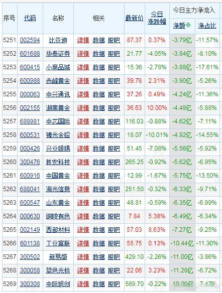收盘价:12.99 元。涨跌幅:-1.67% 。净流入: -5.75亿