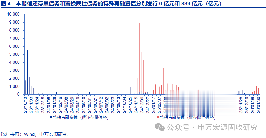 本期特殊新增专项债发行191亿元,置换隐债和偿还存量债务的特殊再融资债分别发行839亿元和0亿元。截至2026年1月30日,2026年特殊新增专项债累计发行287亿元(本期发行191亿元);置换隐债特殊再融资债累计已发行2507亿元(本期839亿元),发行进度达12.5%;偿还存量债务的特殊再融资债累计发行36亿元(本期0亿元)。