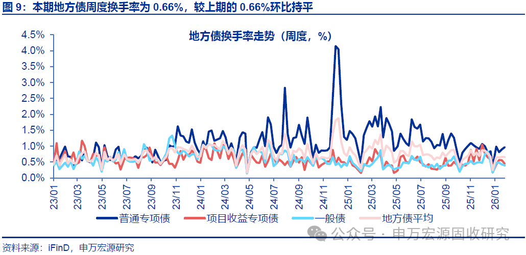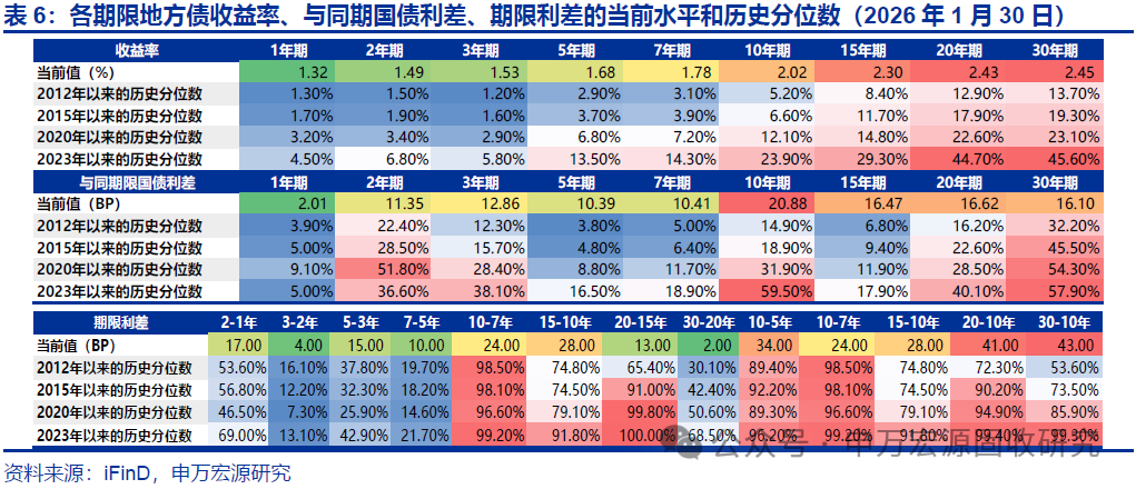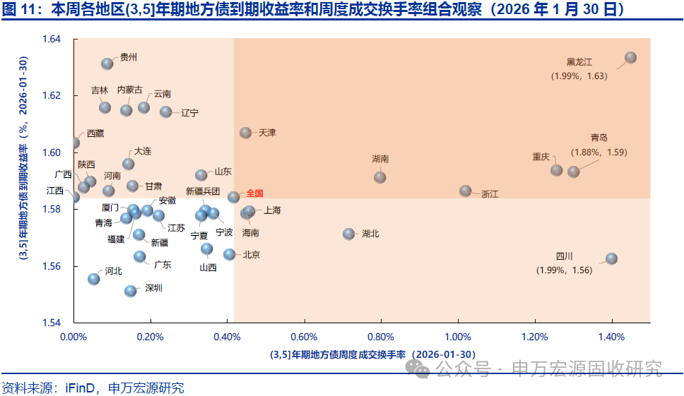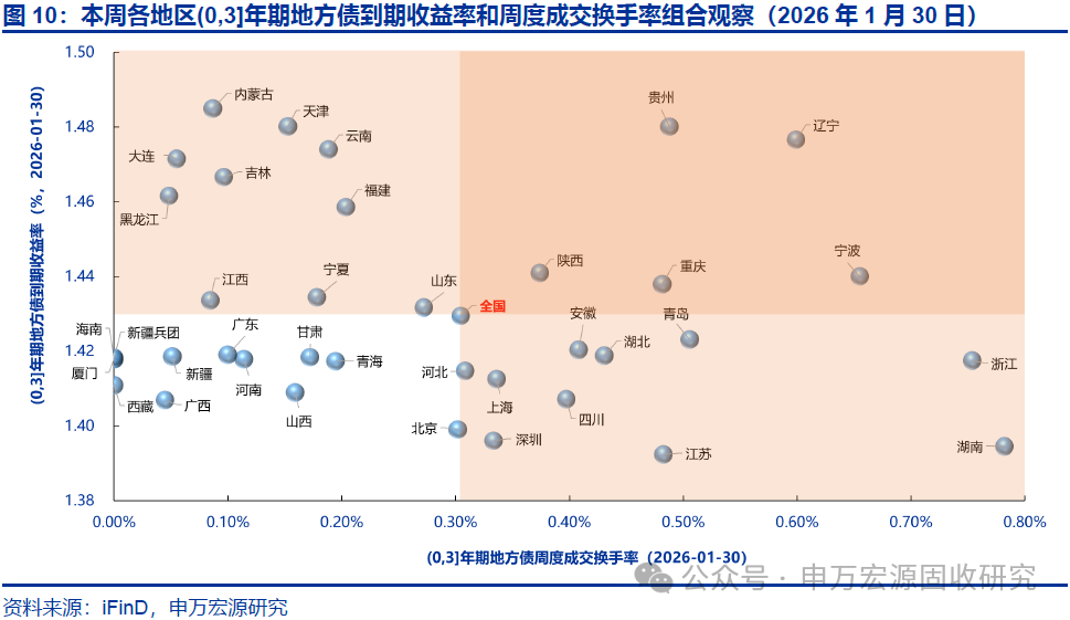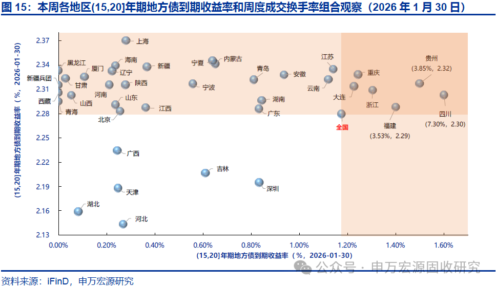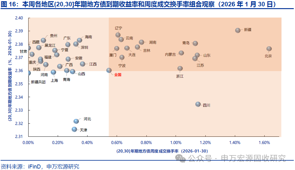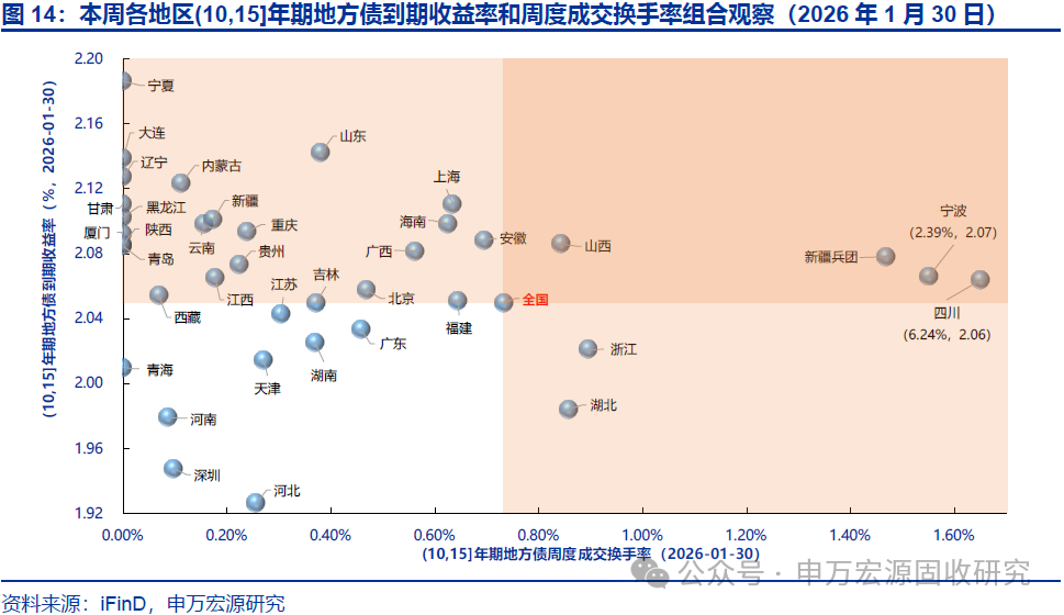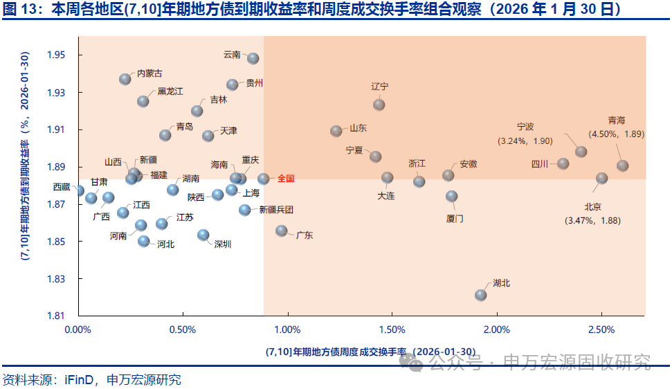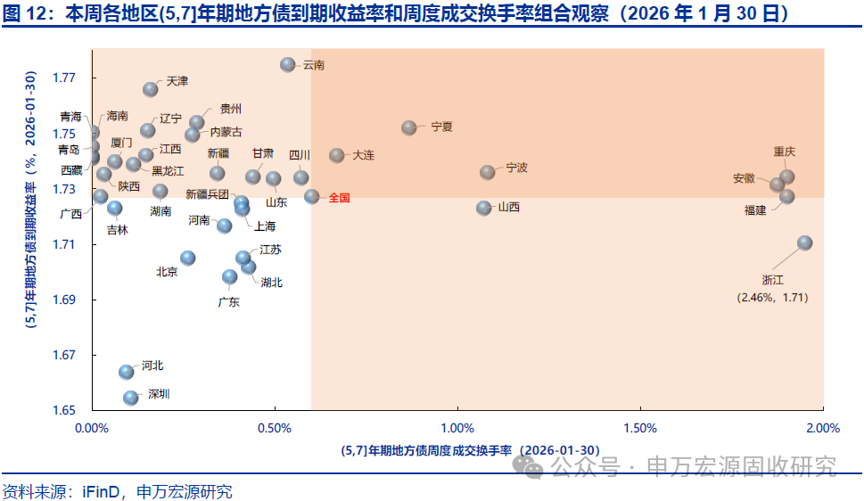 本期地方债减国债利差10Y收窄、30Y走阔,周度换手率环比持平。截至2026年1月30日,10年和30年地方债减国债利差分别为20.88BP和16.10BP,较2026年1月23日分别收窄0.14BP和走阔1.81BP,分别处于2023年以来历史分位数的59.50%和57.90%。本期地方债周度换手率为0.66%,较上期的0.66%环比持平。本期宁波、青海、四川等地区7-10Y地方债收益率和流动性皆优于全国平均水平。