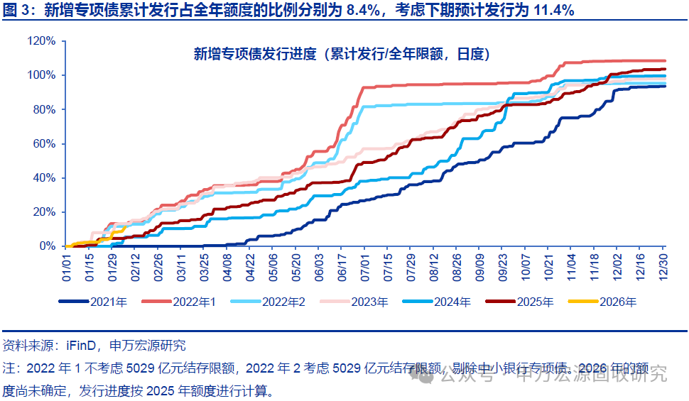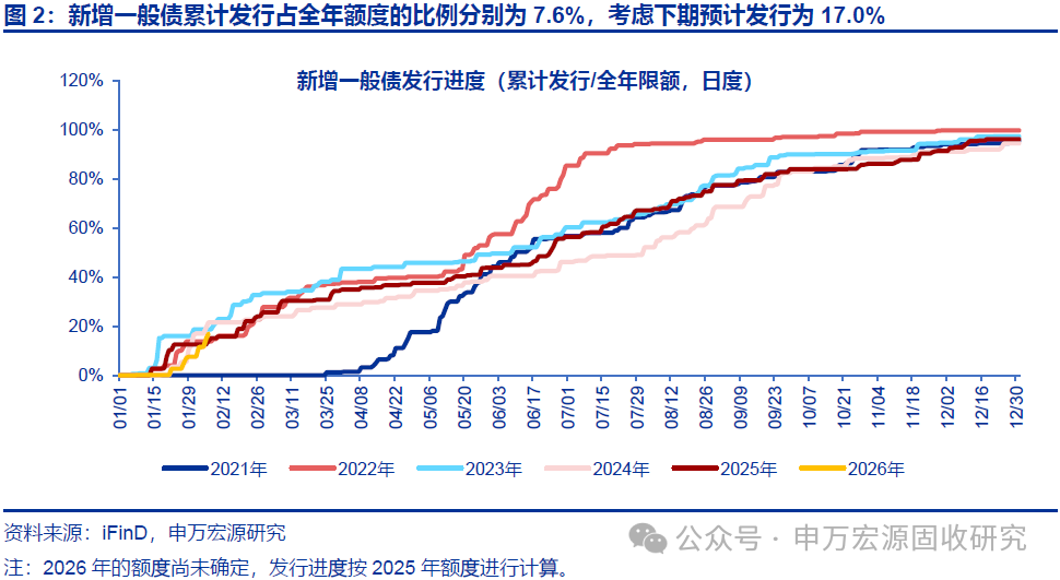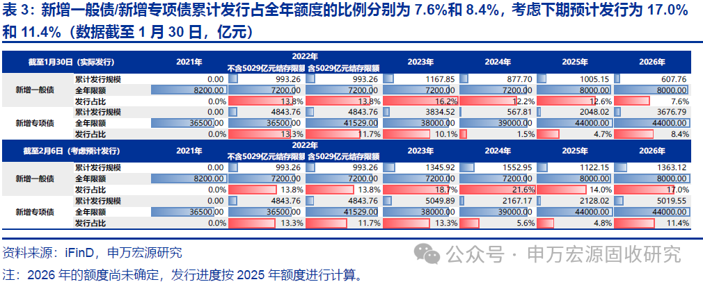 今年新增一般债发行进度慢于24/25年同期,但新增专项债发行进度更快。截至2026年1月30日,新增一般债/新增专项债累计发行占全年额度(以2025年额度进行测算)的比例分别为7.6%和8.4%,考虑下期预计发行为17.0%和11.4%。2025年累计发行进度分别为12.6%/4.7%和14.0%/4.8%,2024年累计发行进度分别为12.2%/1.5%和21.6%/5.6%。