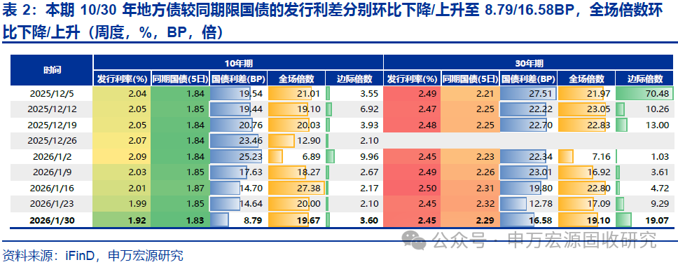 本期地方债发行与净融资皆环比大幅上升,预计下期地方债发行和净融资将环比上升。本期(2026.1.26-2026.2.1)地方债合计发行/净融资4392.75亿元/3108.54亿元(上期为2315.70亿元/2031.60亿元),下期(2026.2.2-2026.2.8)预计发行/净融资5796.73亿元/5789.27亿元。从加权发行期限来看,本期地方债加权发行期限为17.31年,较上期(2026.1.19-2026.1.25)的15.88年有所拉长。从发行情绪来看,本期10/30年地方债较同期限国债的发行利差环比下降/上升至8.79/16.58BP(上期为14.64/12.78BP),全场倍数环比下降/上升(本期分别为19.7倍和19.1倍,上期为20.0倍和17.1倍)。