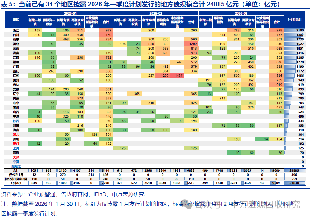 2026年一季度计划发行的地方债规模合计24885亿元,与2025年同期相当。截至2026年1月30日,已有31个地区披露2026年一季度或1月和2月计划发行的地方债规模合计24885亿元,其中披露一季度发行计划地区合计发行规模23830亿元,去年同地区同期发行为20828亿元。分月份来看,与往年发行集中在2-3月不同,由于26年春节较晚(2月),2026年1月和3月计划发行规模更大。2026年1-3月各月计划发行规模分别为8444亿元(实际发行8633亿元)、6832亿元和9609亿元,去年同地区同期发行分别为3920亿元、11599亿元和8081亿元。结合下周预计发行情况,2月地方债发行高峰或主要在第一周(计划发行5797亿元,占全月发行计划的85%),且置换隐债特殊再融资债发行将明显提速。