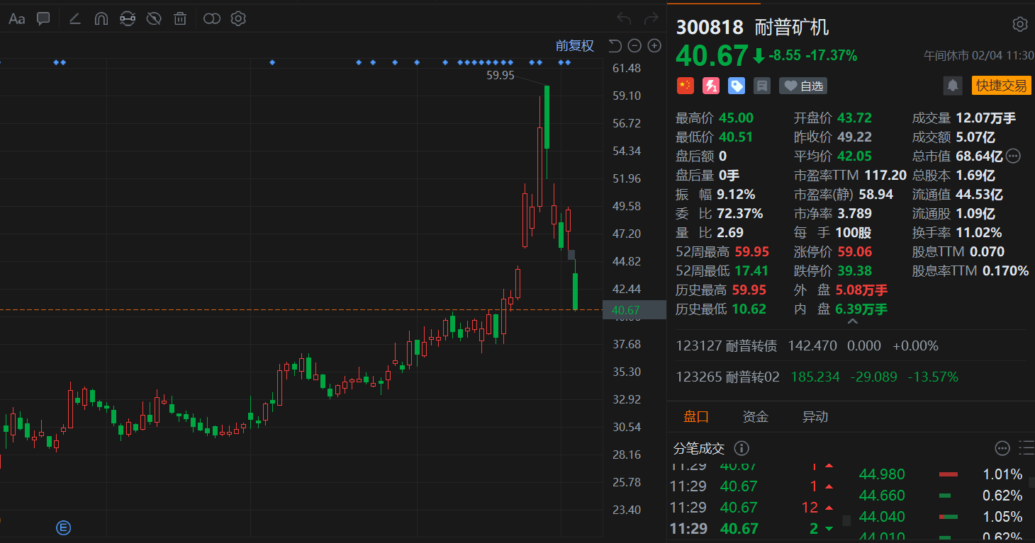 耐普矿机(300818.SZ)大幅下挫超17%,跌幅居市场首位,近日走出“过山车”行情,5日累计跌近30%,报40.67元,总市值68.6亿元。消息上,耐普矿机昨日晚公告称,将终止认购瑞士VeritasResourcesAG(简称“维理达资源”)股权,并同步放弃对哥伦比亚Alacran铜金银矿项目的后续投资。耐普矿机的主营业务是集研发、生产、销售和服务于一体的重型矿山选矿装备及其新材料耐磨备件专业制造。