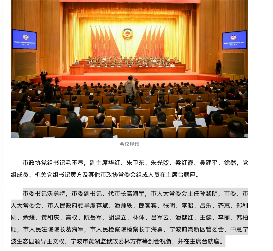 市委书记沃勇特,市委副书记、代市长高海军,市人大常委会主任孙黎明,市委、市人大常委会、市人民政府领导虞存斌、潘帅轶、郎客宾、张明、李昭、吕乐、齐惠、郑利刚、余烽、黄和庆、高权、阮岳军、胡建立、林体、吕军云、潘健红、王健、李丽、韩柏顺,市人民法院院长葛海军,市人民检察院检察长丁海勇,宁波前湾新区管委会、中意宁波生态园领导王文权,宁波市黄湖监狱政委林方存等到会祝贺,并在主席台就座。