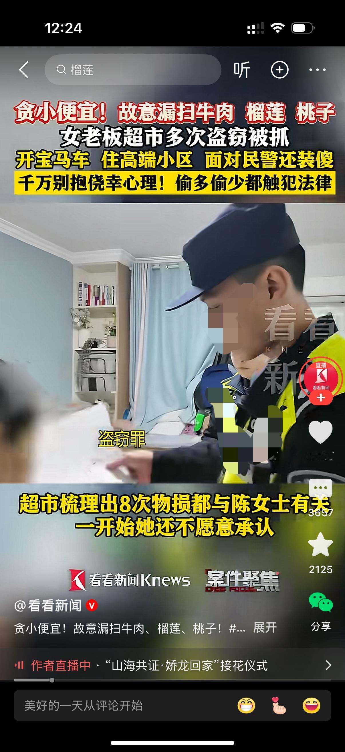 女老板超市多次盗窃被抓。她贪小便宜,故意漏扫牛肉,榴莲,桃子。当帽子叔叔说她犯了盗窃罪时,她还装傻,盗窃?民警问她,你有没有故意漏刷物品?女子说,我不知道,我都付钱了啊。民警直接给出视频证据,证明超市的8次物损都和这个女老板有关。女子无话可说。民警说,你住的是高档小区,开的是宝马,生活水平也算过的去,为什么要贪这种便宜呢?女子沉默不语,等待她将是法律的严惩。