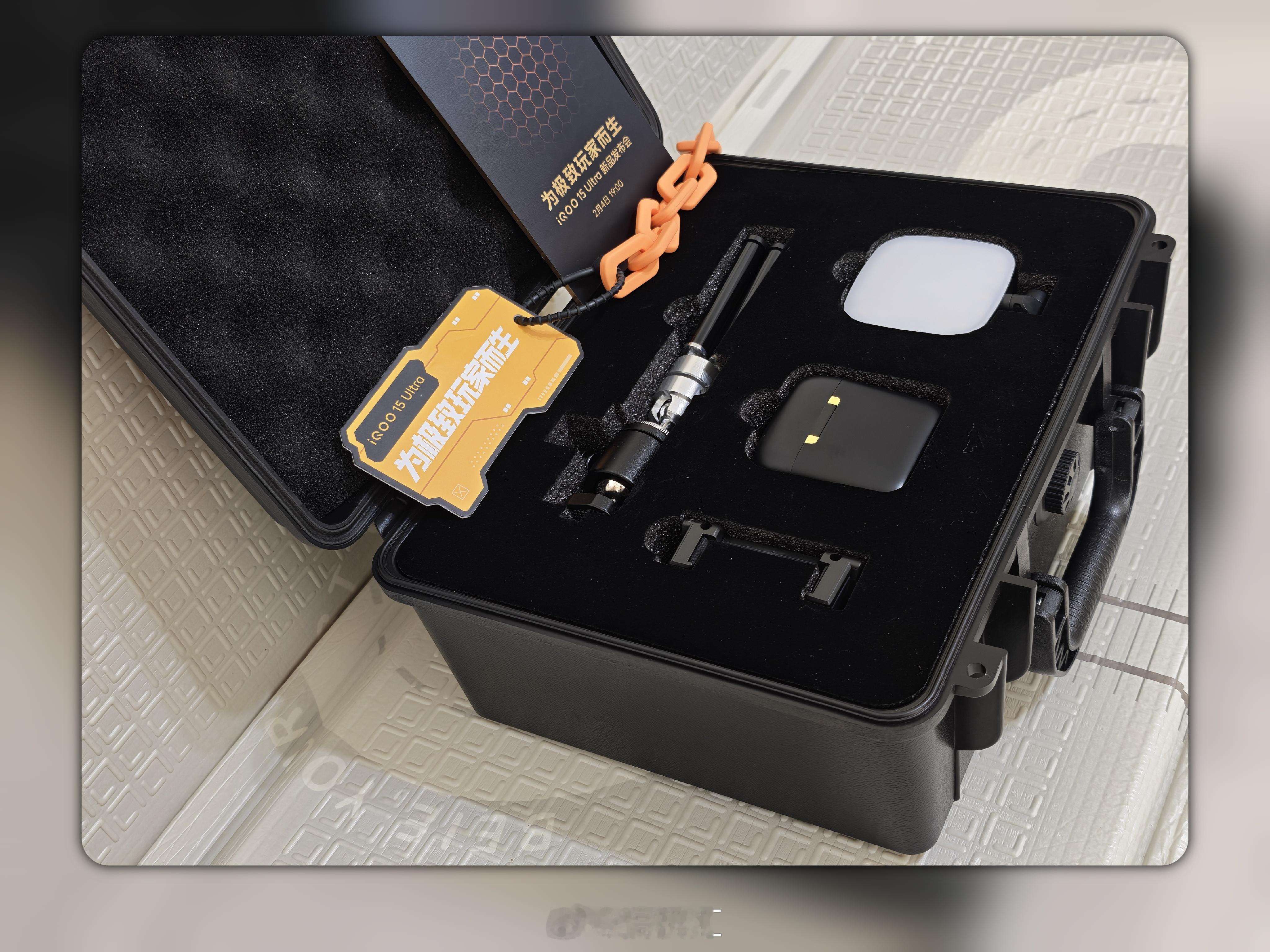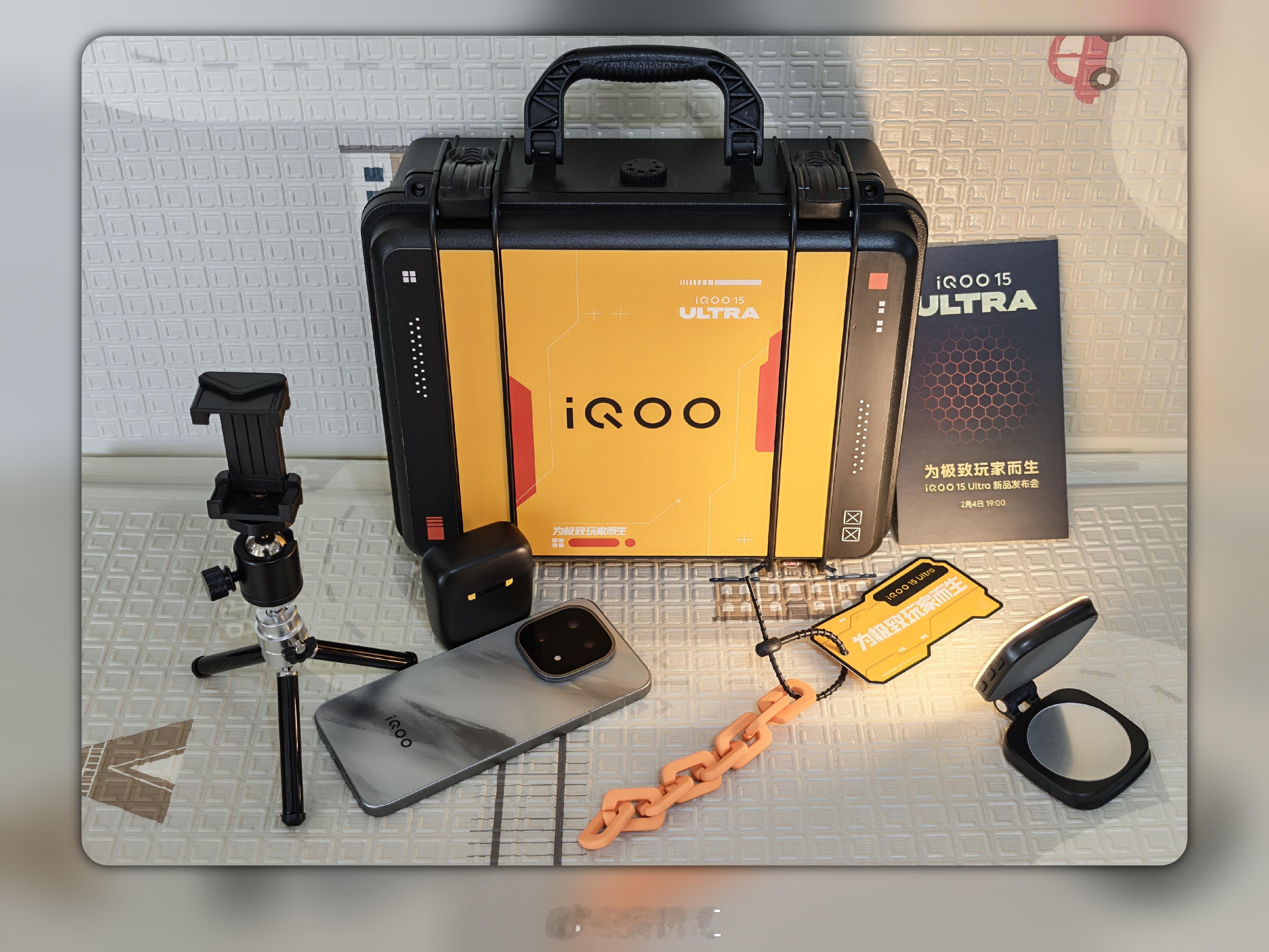 收到了iQOO 15 Ultra的邀请函,里面有桌面三脚架、磁吸补光灯、无线麦克