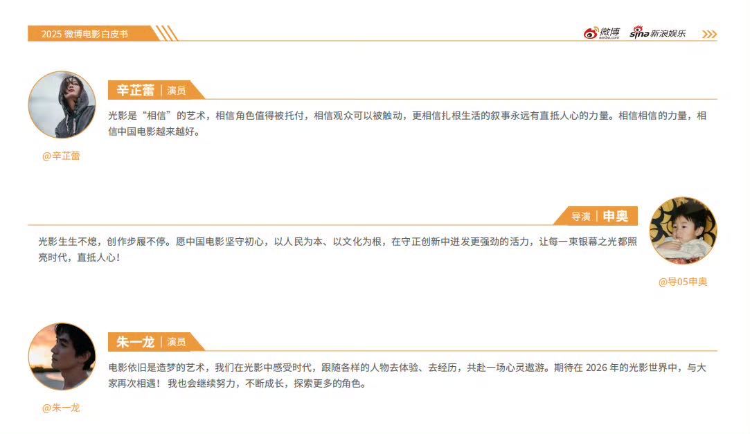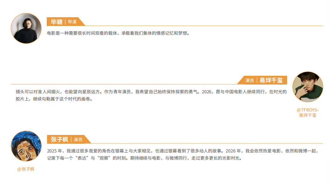 电影行业寄语含金杯量 一字一句,皆是热爱。张艺谋、惠英红、贾樟柯、舒淇、於水、宋佳、辛芷蕾、申奥、朱一龙、毕赣、易烊千玺、张子枫为《2025微博娱乐白皮书电影篇》留下行业寄语。微博娱乐白皮书