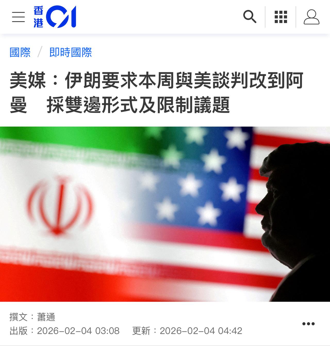 【观世界】【伊朗要求本周与美谈判改到阿曼⋯】 看地图,马上明白!不想重蹈覆辙在卡塔尔开会的事件!阿曼在伊朗导弹全覆盖范围。(最后一刻改场地,你懂的⋯⋯) 美国媒体Axios于2月3日报道,伊朗已要求更改6日与美国谈判的地点和形式,将谈判地点从土耳其改为中东国家阿曼(Oman),并希望会谈以双边形式举行。 伊朗外交部发言人其后表示,关于与美国举行会谈地点的磋商正在进行中,土耳其、阿曼及该地区其他几个国家,都已表示愿意主办会谈。 发言人又称,美伊会谈的地点和时间并非复杂问题,不应作为媒体炒作的借口。 伊朗 美国 阿曼