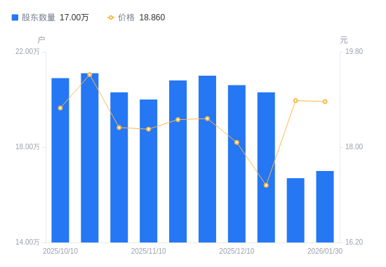 日期A股户数(户)流通A股户均持股数(股)户均持股市值(万元)2026-01-301700008191.5215.452026-01-201670008338.6815.742025-12-192030006859.9011.852025-12-102060006760.0012.232025-11-282100006631.2312.292025-11-202080006695.0012.402025-11-102000006962.7912.772025-10-312030006859.9012.602025-10-202110006599.8112.782025-10-102090006662.9612.49