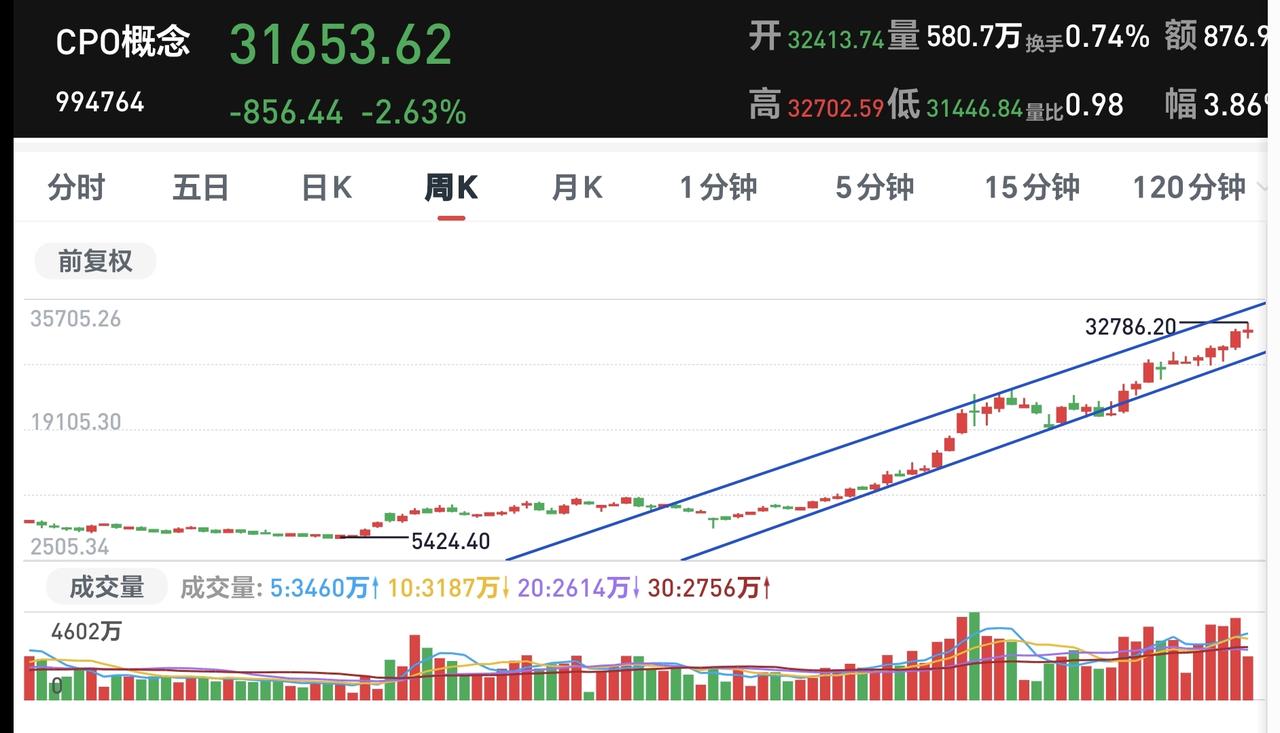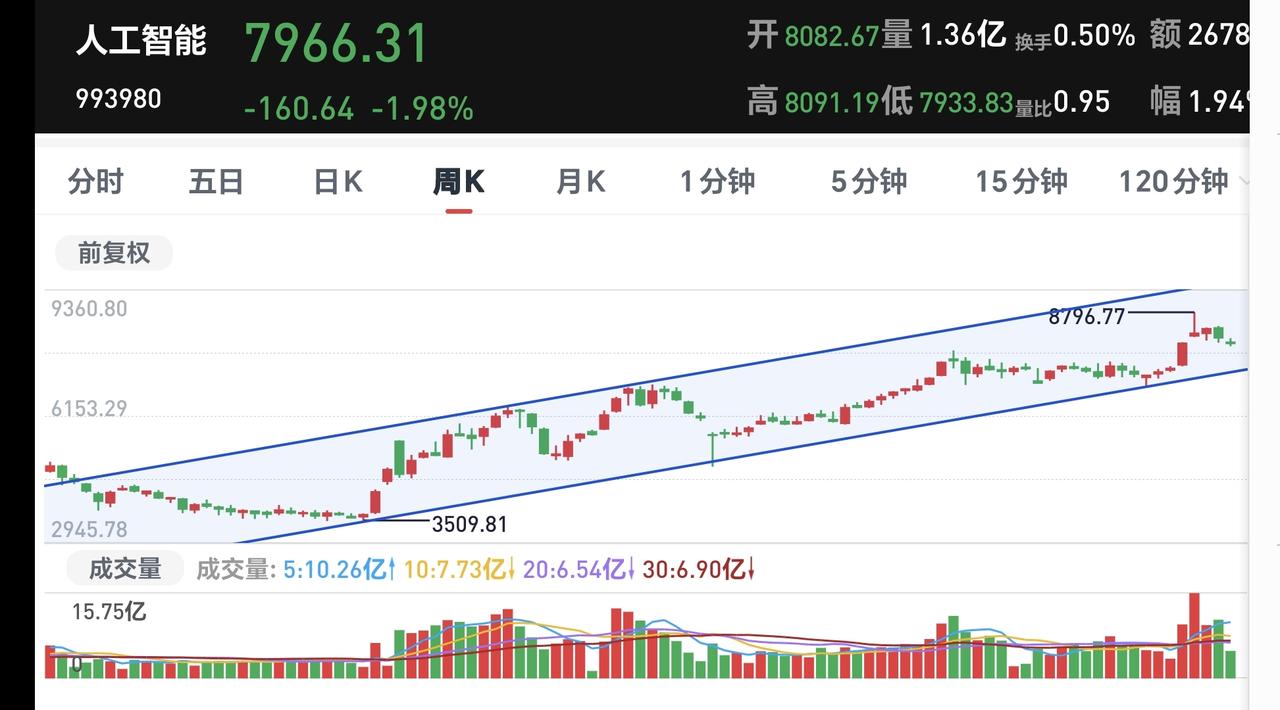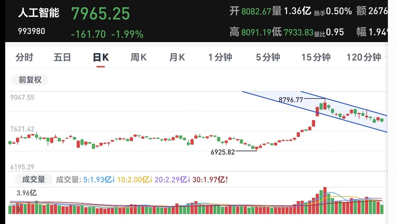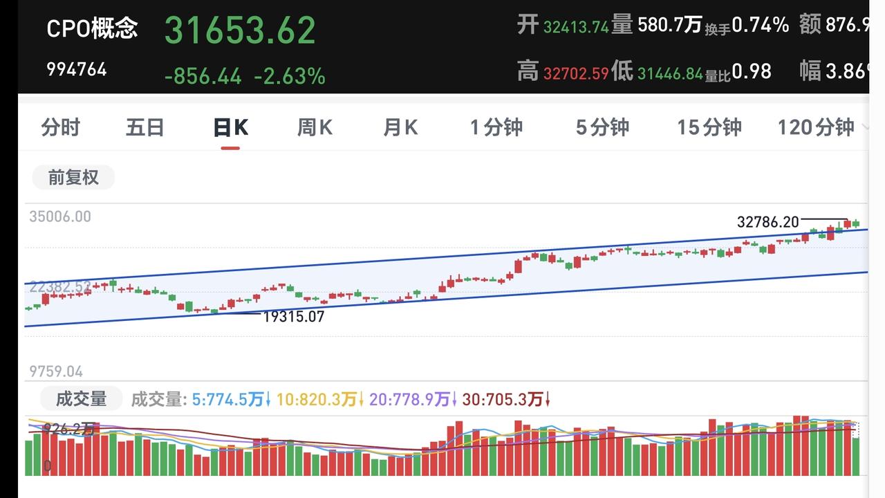 基金:人工智能板块和CPO板块应该怎么办 指数就是一个小幅度震荡走势,现在上证指数上涨,创业板指和深成指下跌,创业板指下跌了1.76%,盘中点位3266点,上证指数上涨了0.21%,盘中点位4076点,都是一些无效波动。 对于上证指数,今天只要看收盘的时候能不能站上五天线,只要是站不上五天线,就不能判断市场已经走强,即使指数是上涨的也不能这样判断,五天线是市场强弱的分水岭。 黄色线还是在蓝色线下方,但好的是,黄色线能够跟随蓝色线上涨,两条线之间的敞口并没有继续放大,两市累计成交18218亿,相比于昨天同期放量了1%,需要放量10%至上才能是有效放量,市场上涨2500多家,下跌2800多家,下跌家数超过了上涨家数,涨停59家,跌停19家,跌停家数需要十家之内才行,主力资金净流出727亿,继续在大幅度净流出。 看下面的截图5,这是主力资金进出板块的情况,主力资金净流入最多的三个板块是:光伏设备板块,光伏板块,红利板块,主力资金净流出最多的三个板块是:高端制造板块,互联网板块,人工智能板块。 持有的基金中,估值上涨幅度最大的三个板块是:白酒板块,大消费板块,上证50板块,下跌幅度最大的三个板块是:AI应用板块,5G板块,先进制造板块,估值整体1.28万元。 今天下跌幅度最大的三个板块是:人工智能板块,AI应用板块,云计算板块,人工智能板块现在盘中估值下跌了4.29%,持有人数在所有板块当中排名第12位。 看下面的截图9,这是人工智能板块日K线图,现在的位置处于日线级别短期下跌通道中,今天的下跌并没有跌破下跌通道的下轨线,也就是并没有进入加速下跌的走势,还是在正常的下跌走势中,想进场的人需要耐心等待上涨突破下跌通道的上轨线,才可以考虑要不要进场。 看下面的截图10,这是人工智能板块周K线图,现在的位置处于上涨通道中,今天的下跌并没有跌破上涨通道的下轨线,也就是人工智能板块上涨趋势并没有被改变,长线持有的人可以继续持有。 看下面的截图11,这是cpo板块日K线图,现在的位置处于上涨通道的上方,今天虽然是下跌,但并没有回到上涨通道内,即使下跌回到上涨通道内,也还是处于上涨趋势中,持有的人可以继续持有。 看下面的截图12,这是cpo板块周K线图,现在的位置处于上涨通道中,近期的涨跌都影响不了上涨通道的上下轨,也就是说,近期的涨跌都改变不了这个板块的上涨趋势,长线持有的人可以继续持有。 有些板块的下跌会改变上涨趋势,有些板块的下跌改变不了上涨趋势,所以同样是下跌,我们会根据不同的板块进行不同的应对。 今天究竟应该怎么办?我会在评论区留言。 每天下午两点左右,我会给大家分享我的观点,一秒钟点赞花,30秒钟评论就是对我最大的支持,谢谢大家的支持。